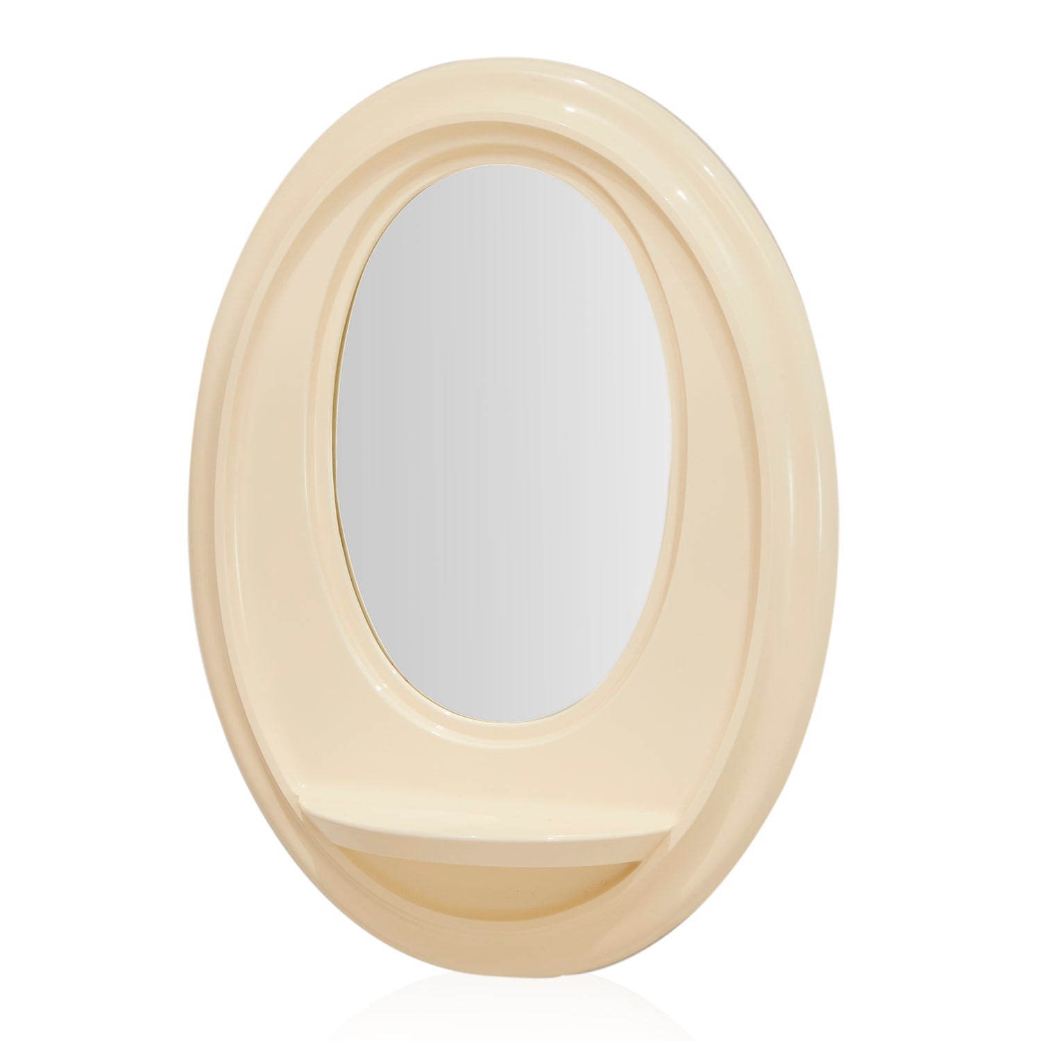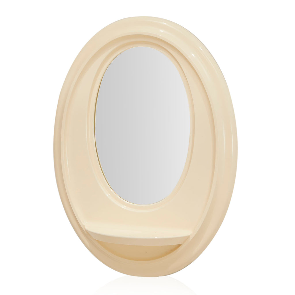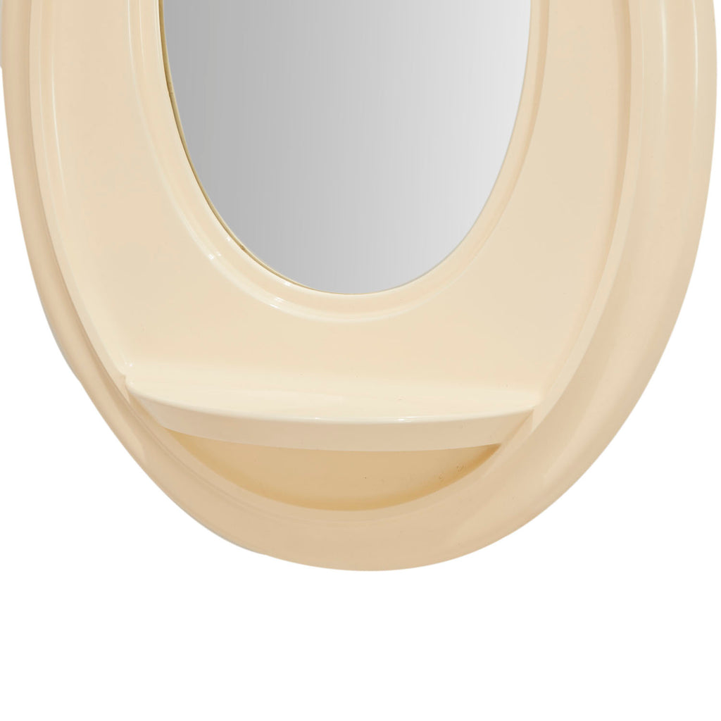 Details: Circular cream-colored wall mirror with a small shelf Dimensions: 29" H x 23" W x 6.5" D