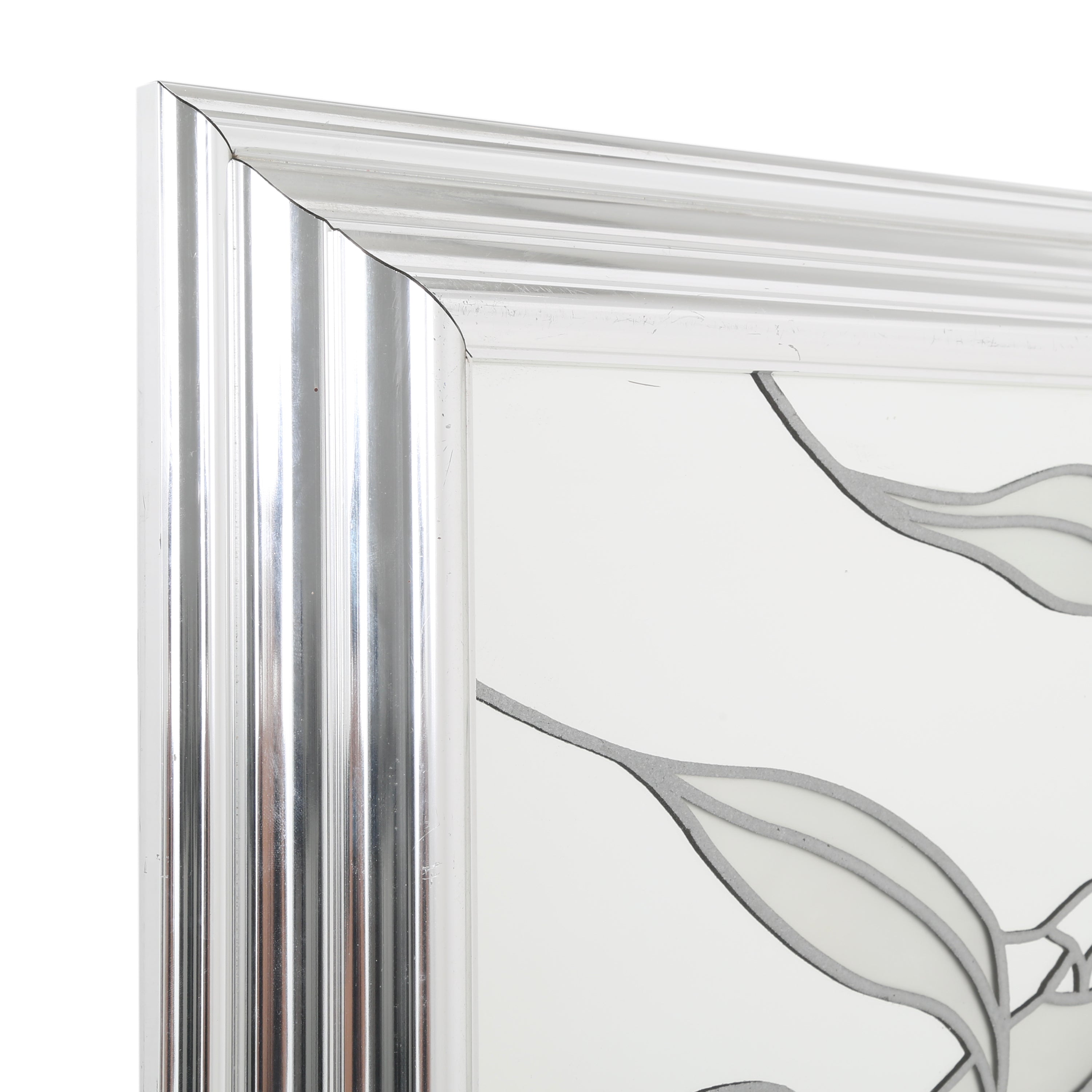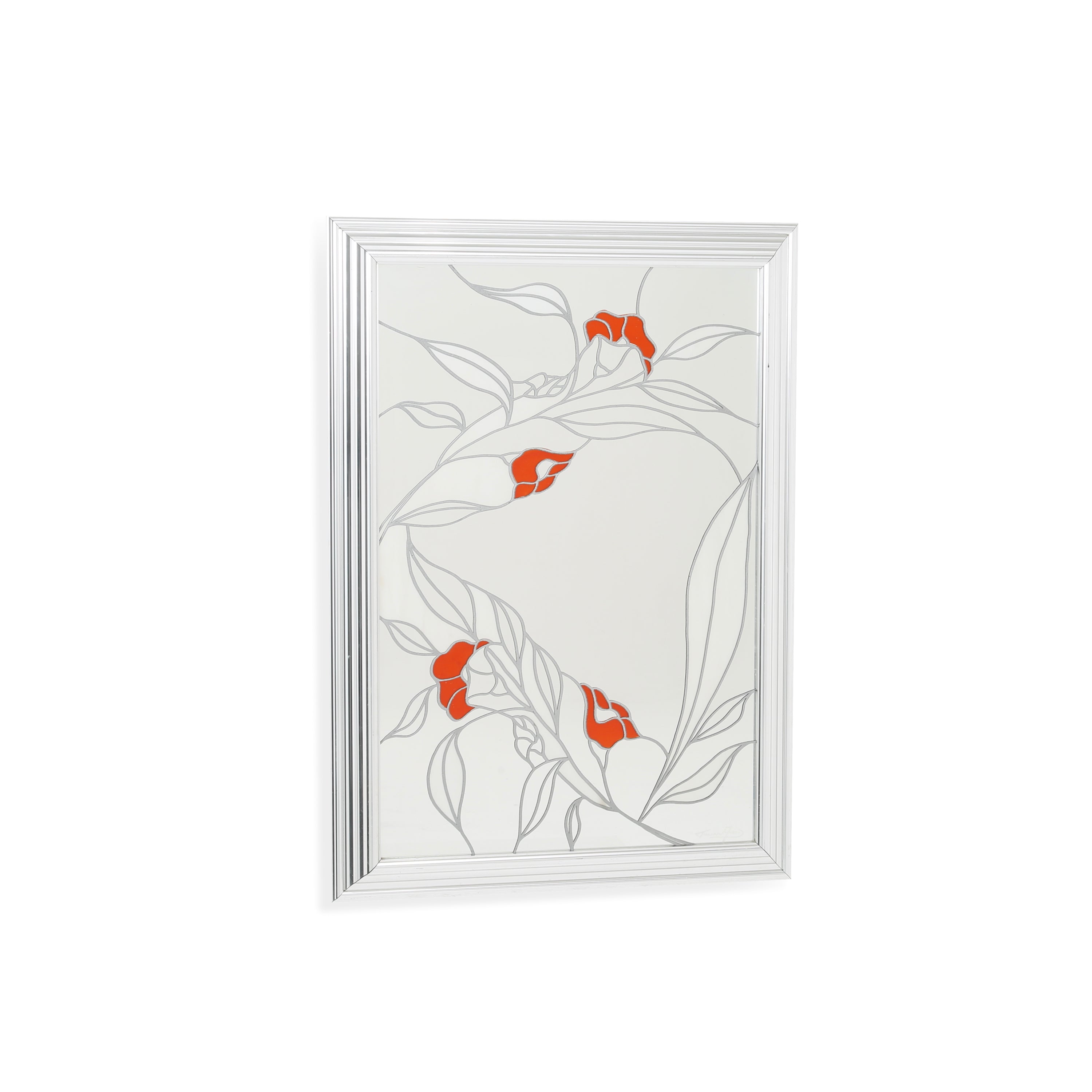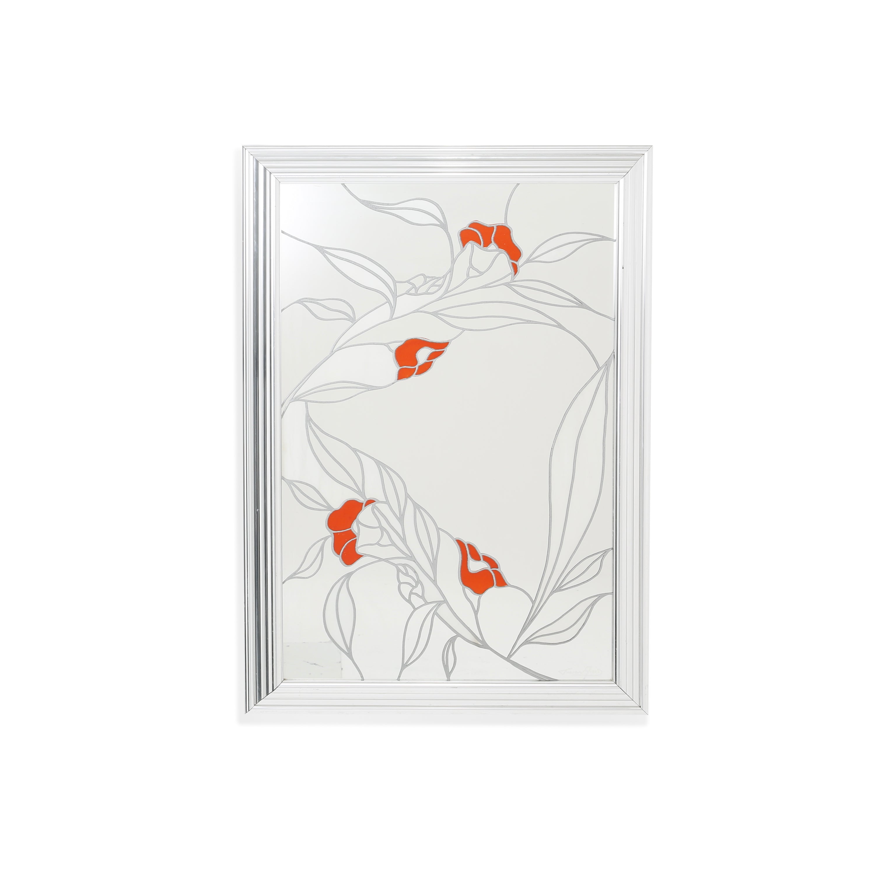 Details: Silver mirror artwork with orange floral accents. Dimensions: 41.25" H x 29.25" W x 1.5" D