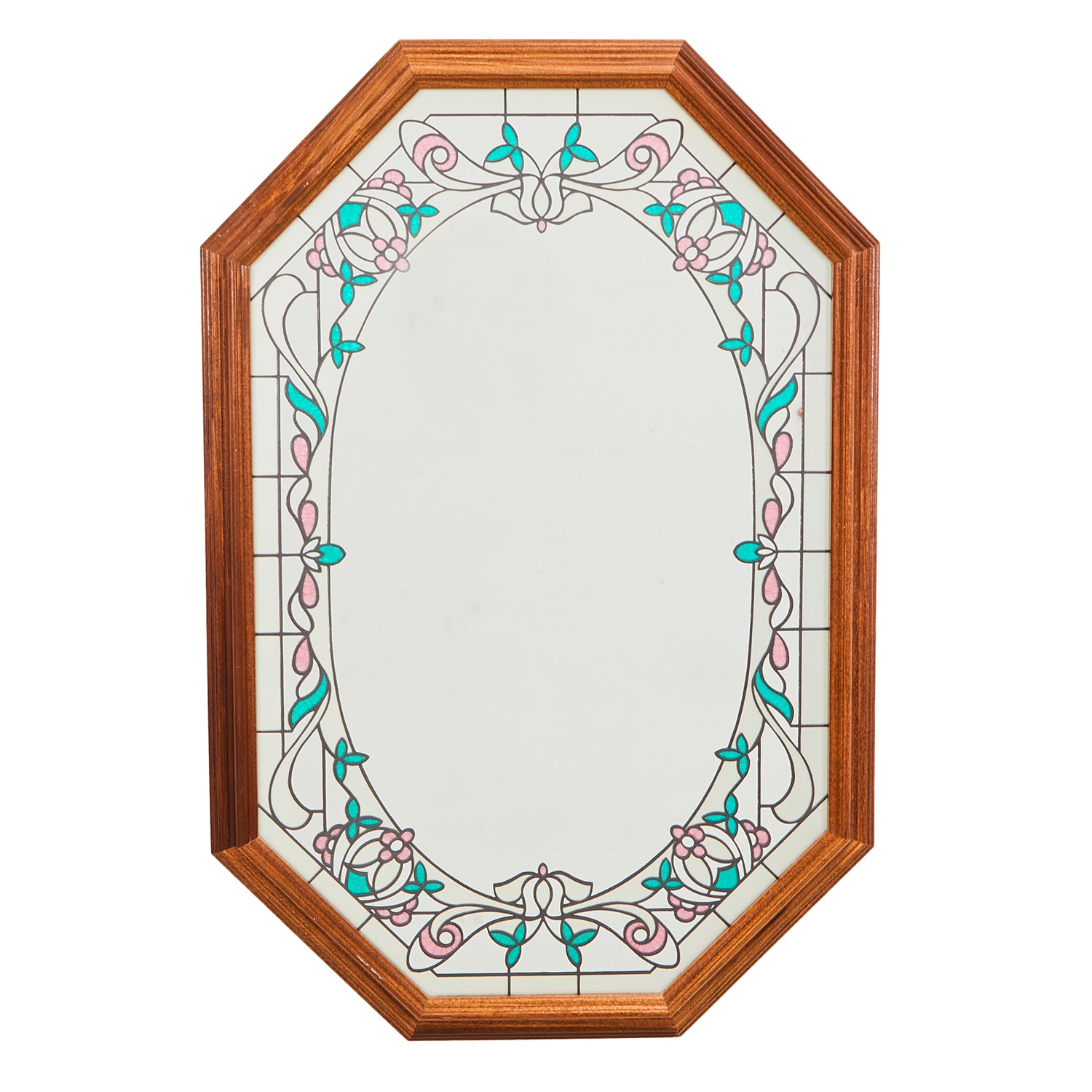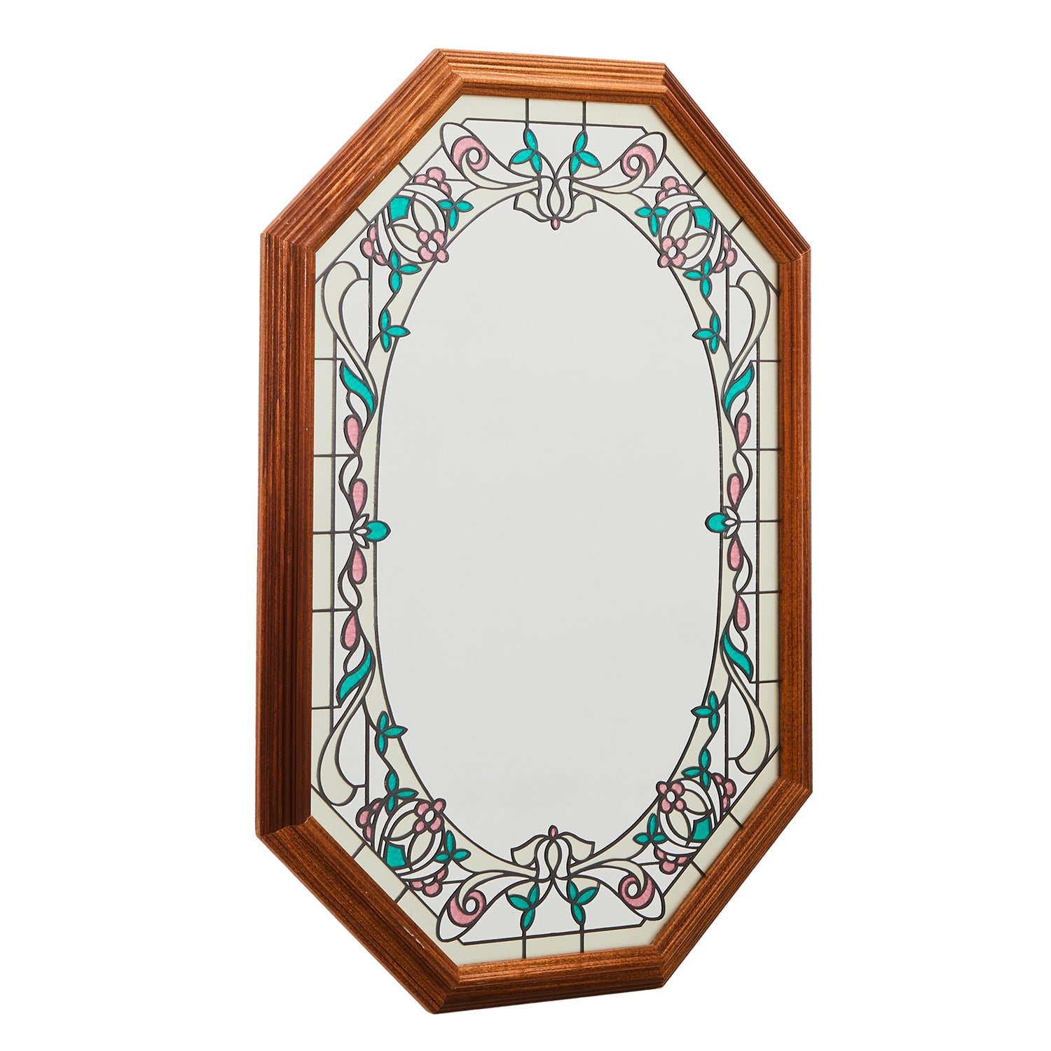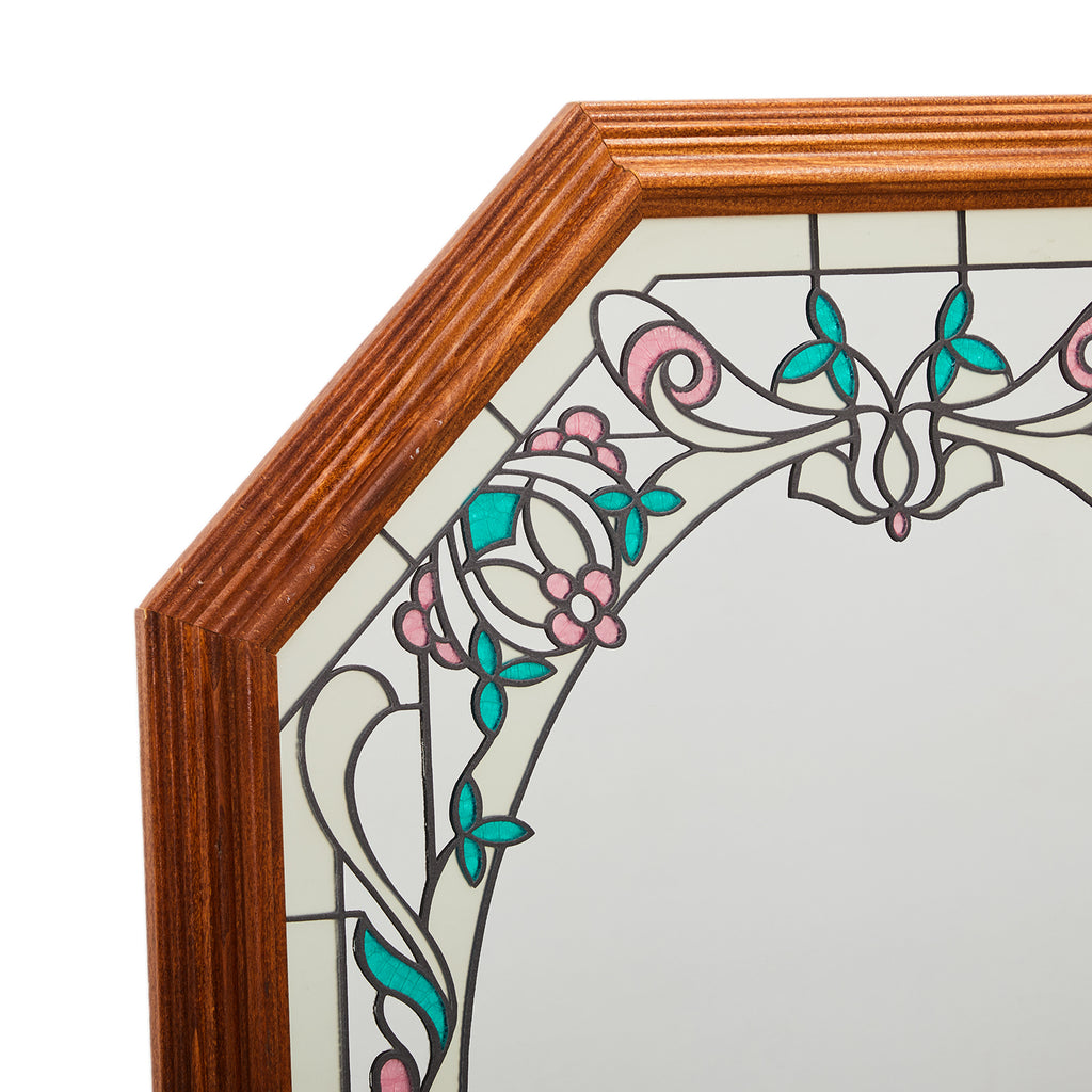 Details: Wood framed octagonal wall mirror with blue and pink stained floral border design Dimensions: 32" H x 21" W x 2" D Quantity: 1
