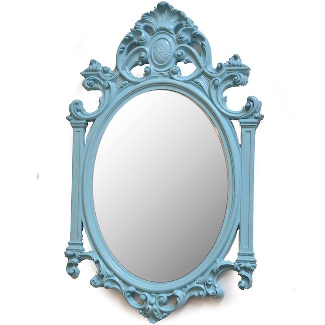 Details: Powder blue oval-shaped wall mirror with victorian-style carved designs Dimensions: 44" H x 26" W x 2" D
