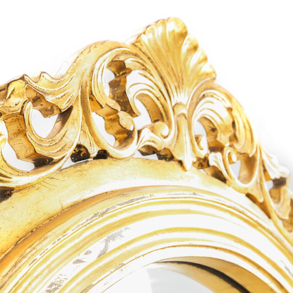Details: Gold extravagant oval mirror frame with ornate baroque decorative flourishes Dimensions: 29" H x 21.5" W x 2" D