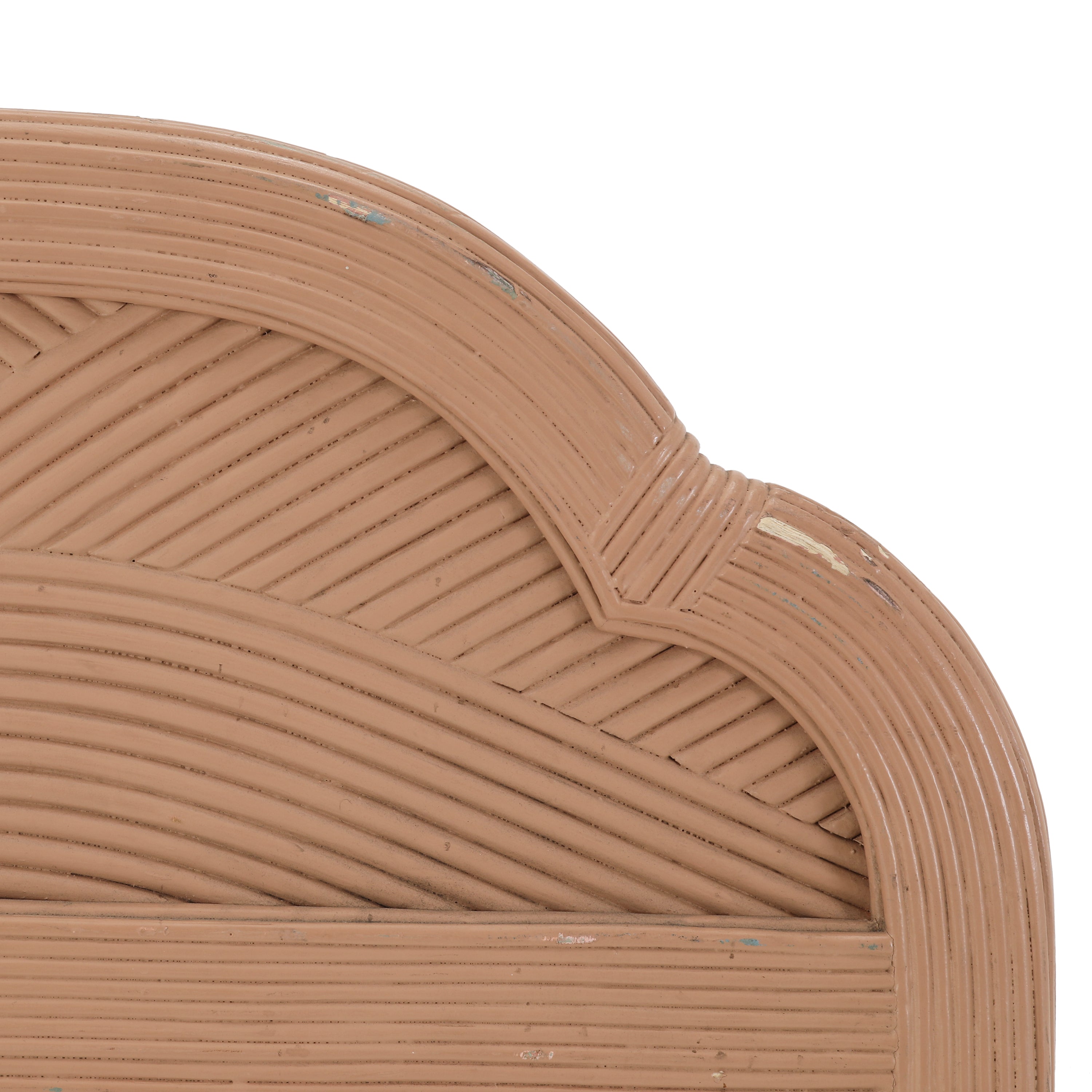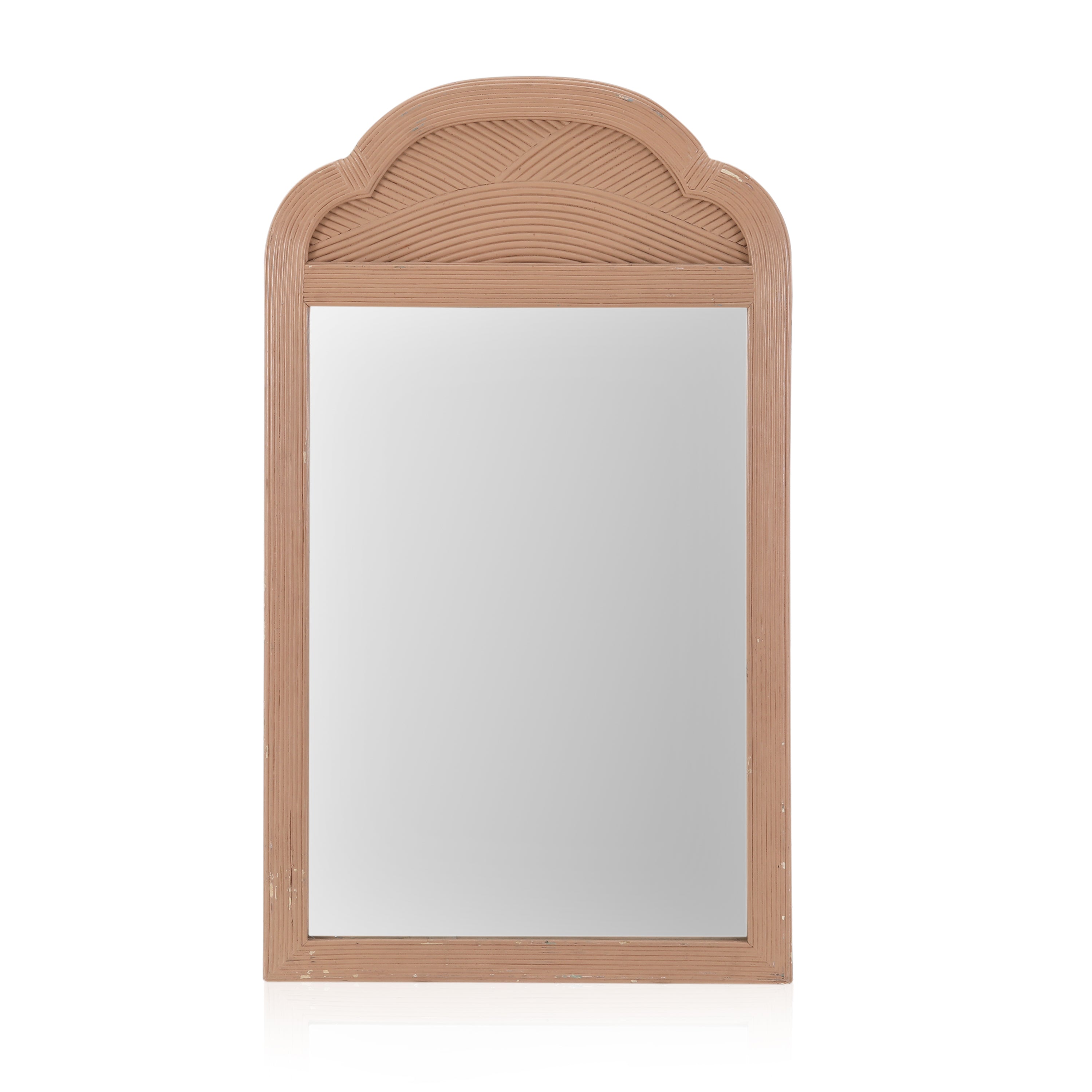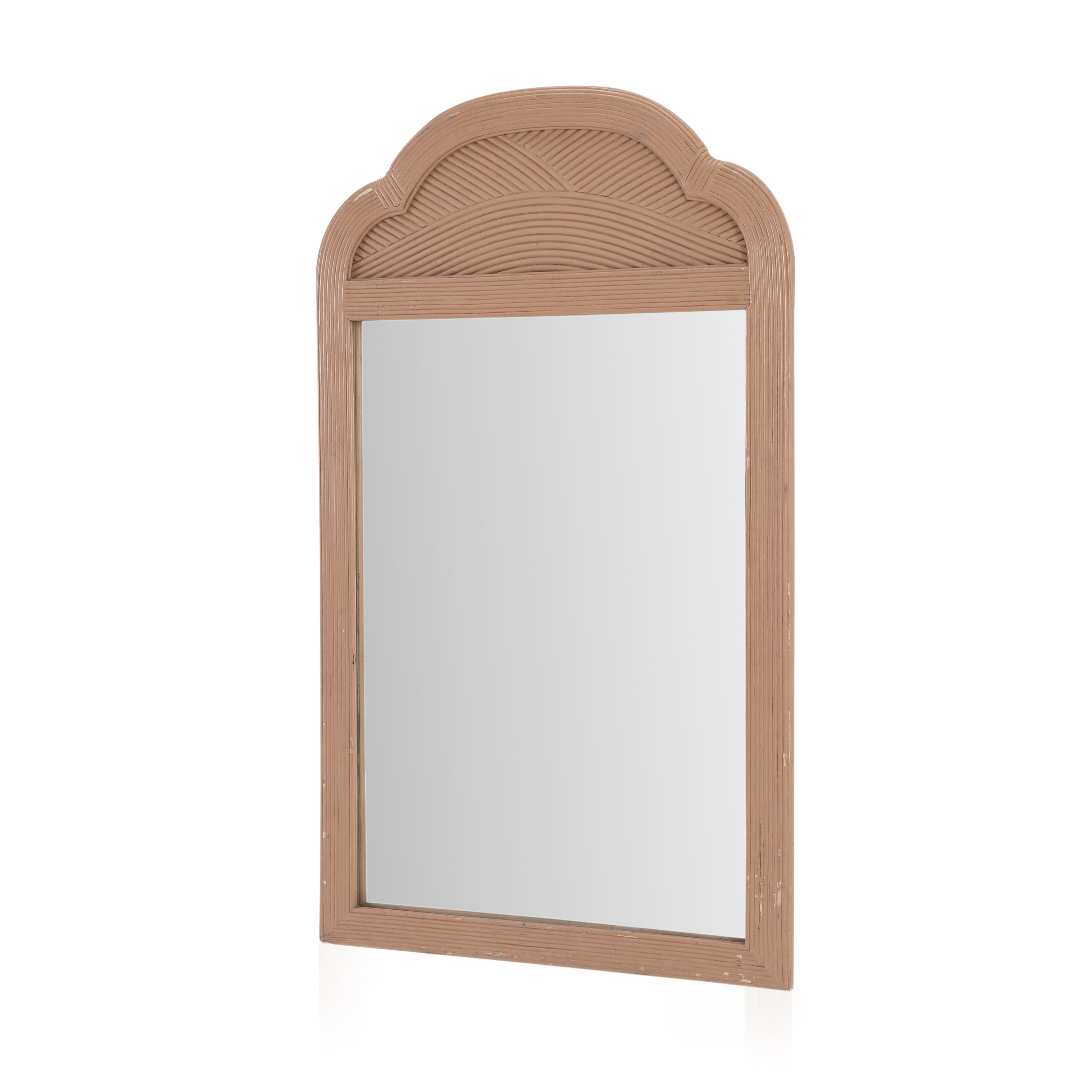Details: Art deco style pink mirror with curved frame on top. Noticeable wear & tear. Dimensions: 48" H x 28" W x 1" D