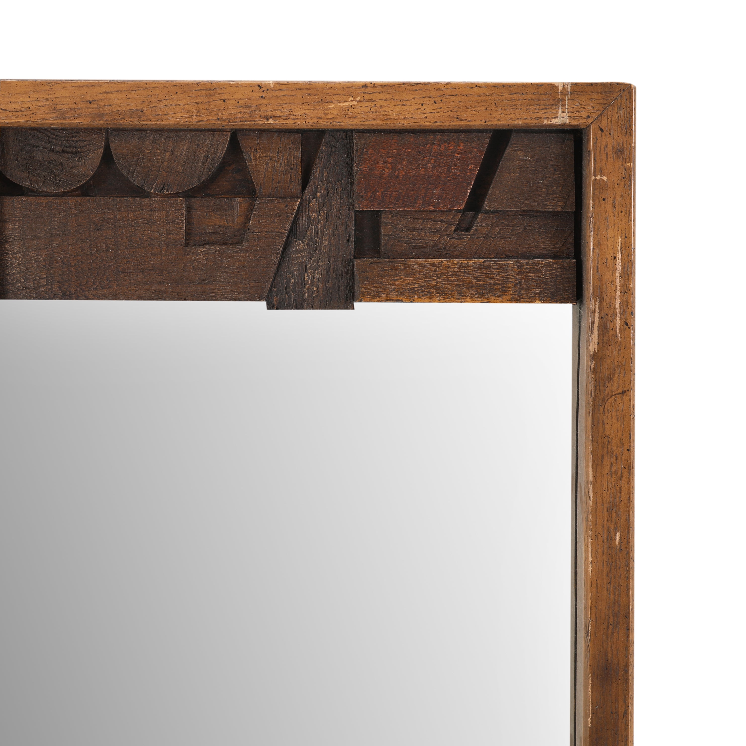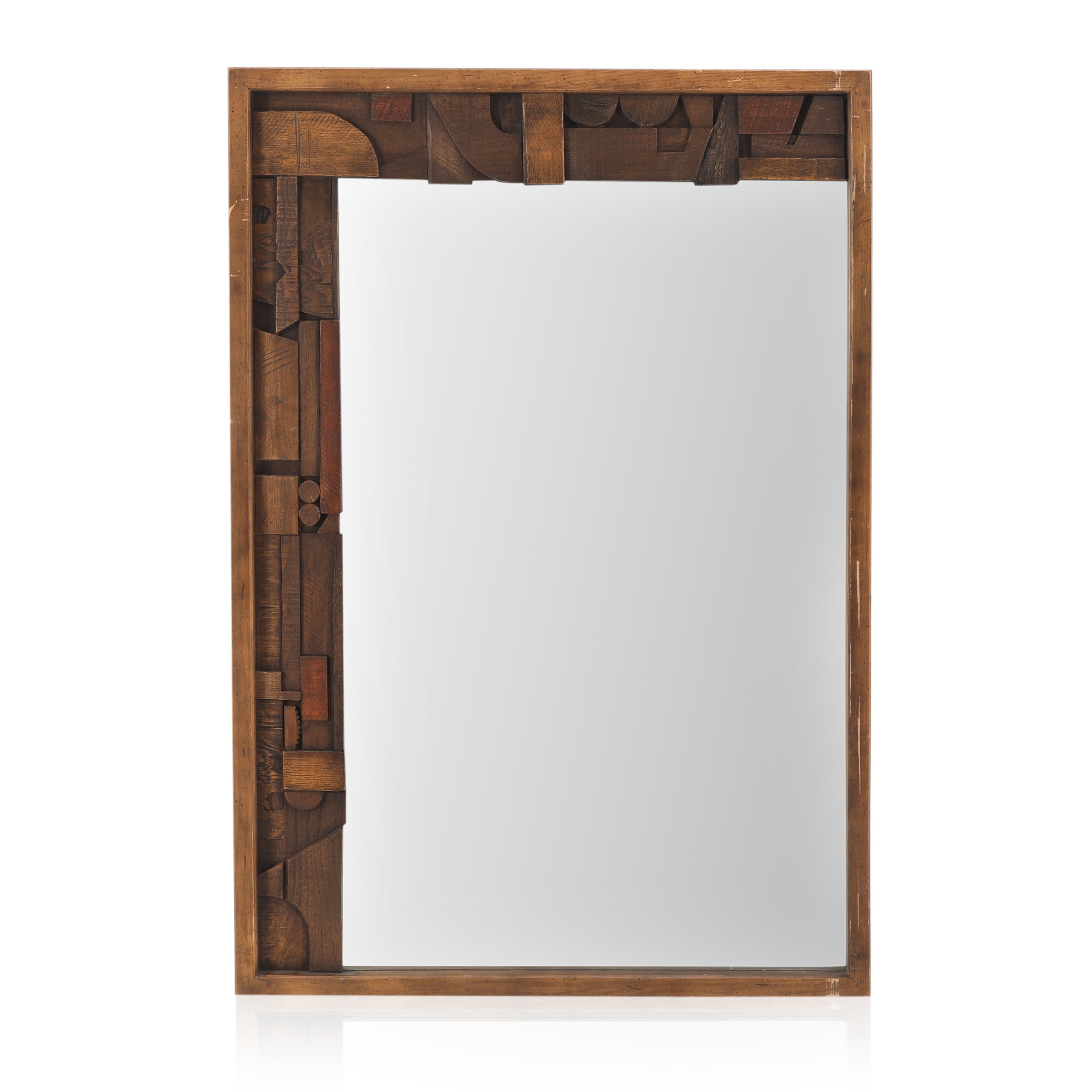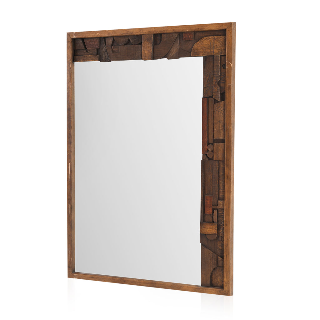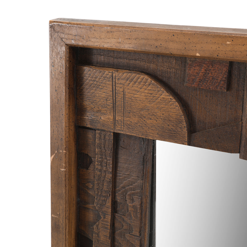 Details: Paul Evans Style Lane Pueblo Brutalist Oak Framed Wall Mirror, 1970s Dimensions: 46" H x 32" W