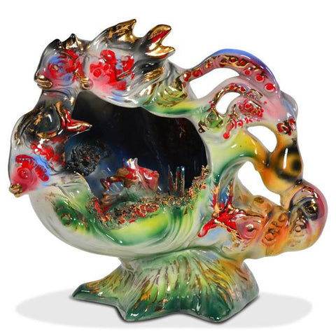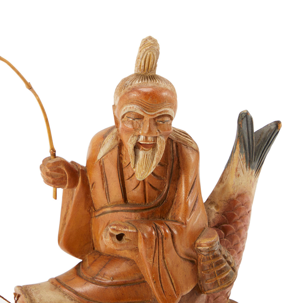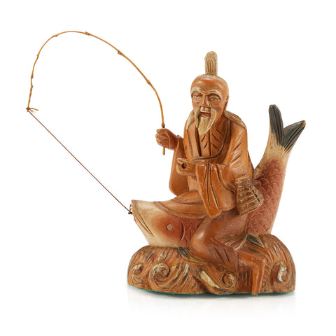 Details: Painted and carved Asian wood figurine of man riding fish he has caught with pole Dimensions: 8" H x 9" W x 3" D...