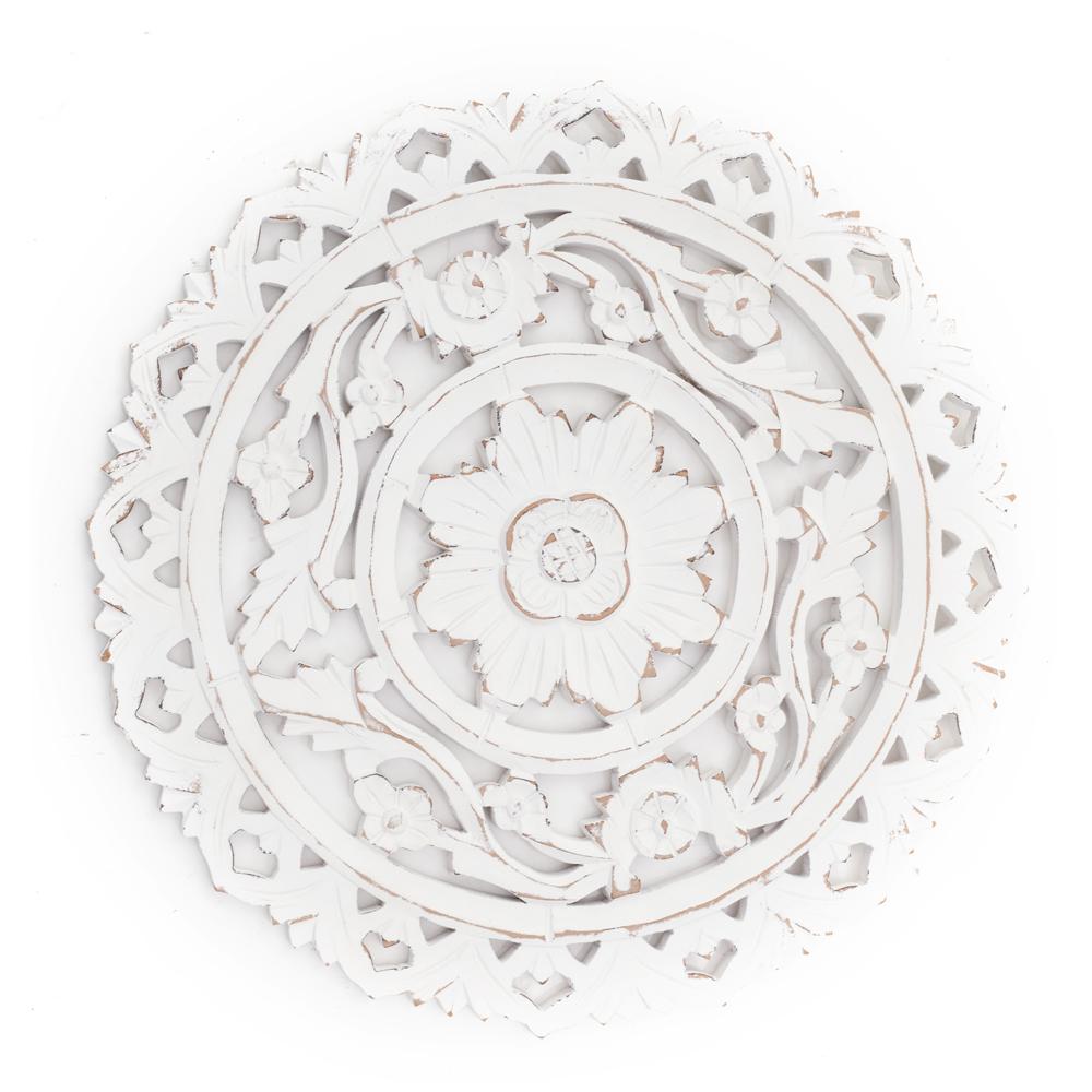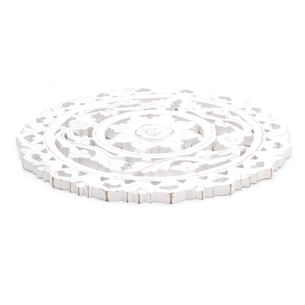 Details: Flat circular white painted wooden Indonesian style carved mandala wall art Dimensions: 16" H x 16" W x 1" D