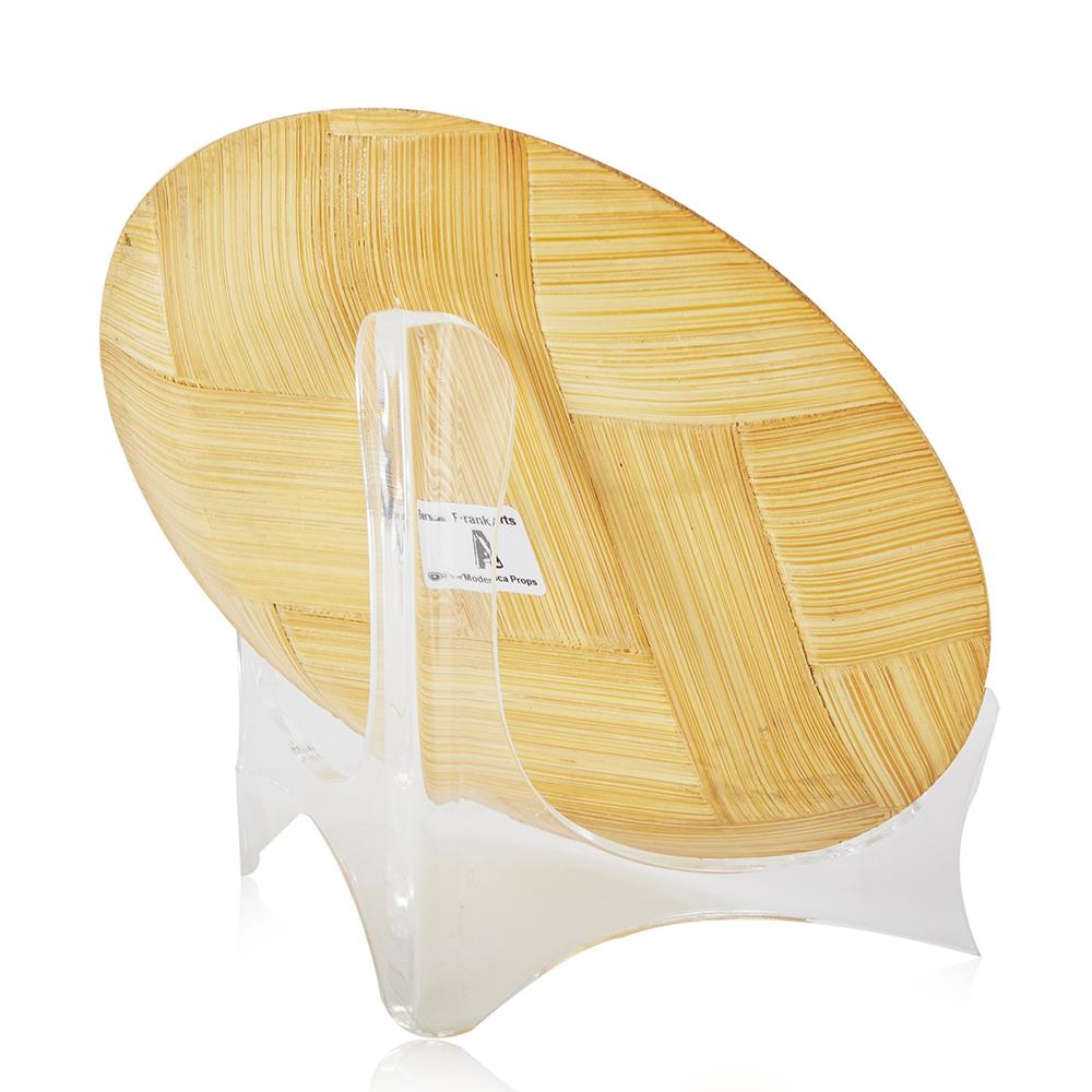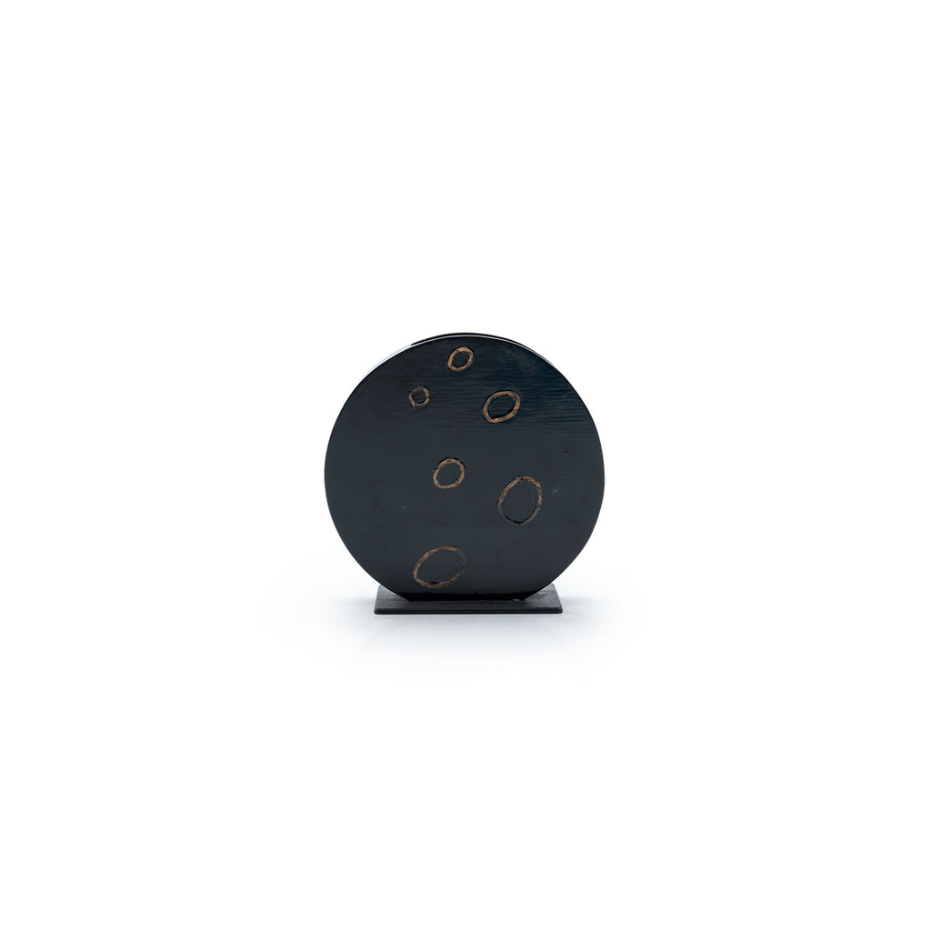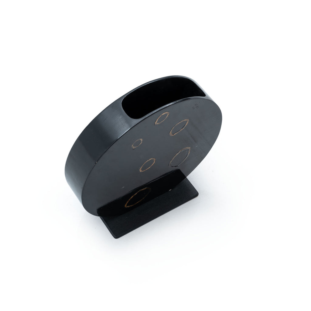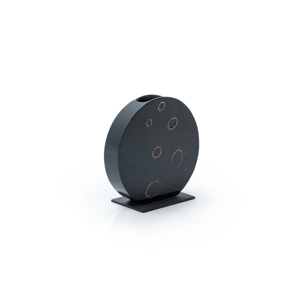 Details: Small black vase in the shape of an upright disc with minimal circular designs and a rectangular base Dimensions: 12" H x 12" W x...