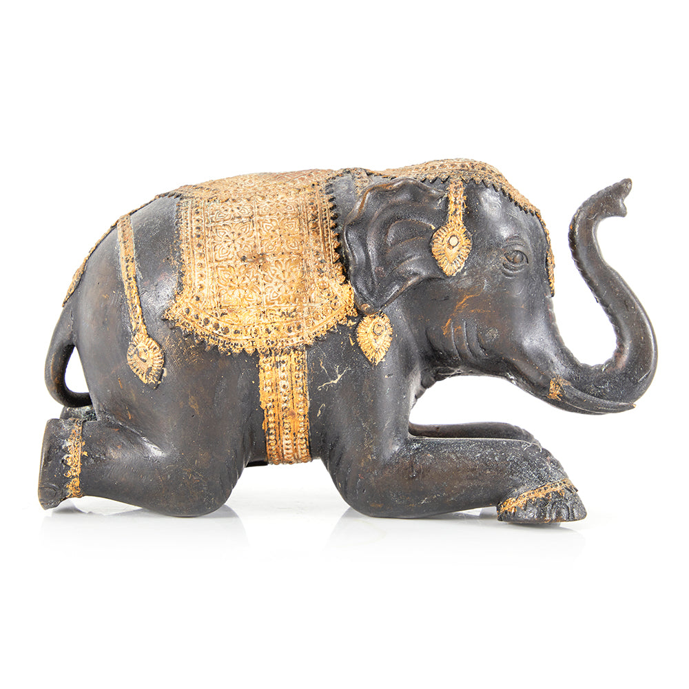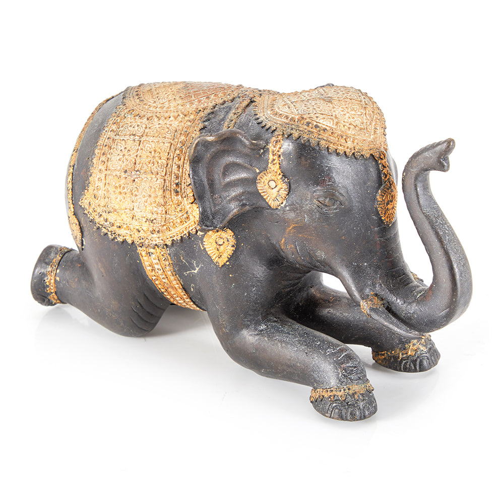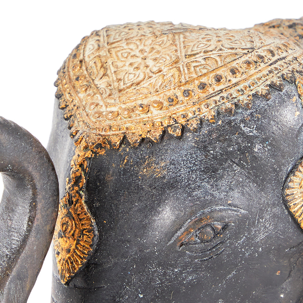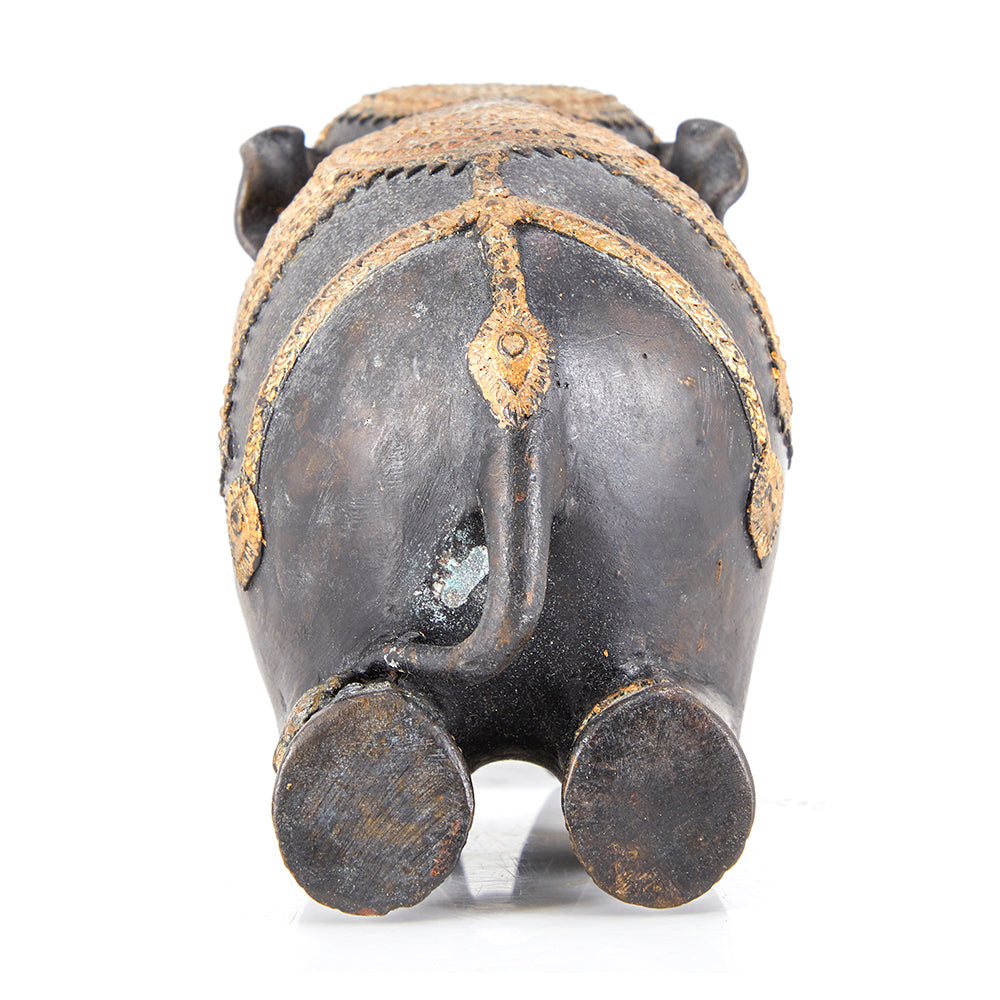 Details: Painted bronze Indian Elephant with black skin and ornate gold dress Dimensions: 5" H x 4" W x 8" D Quantity: 1