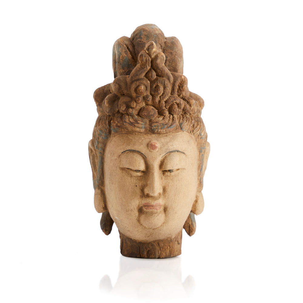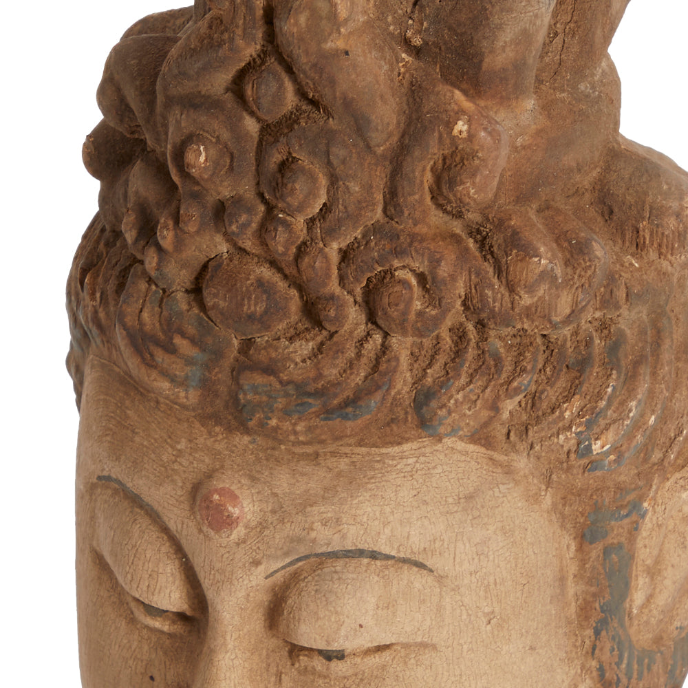 Details: Carved wood Buddhist sculpture depicting the head of bodhisattva Kuan Yin Dimensions: 4" H x 4" W x 5" D Quantity: 1