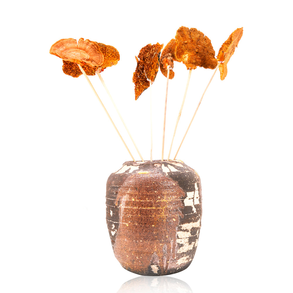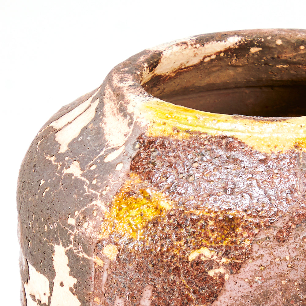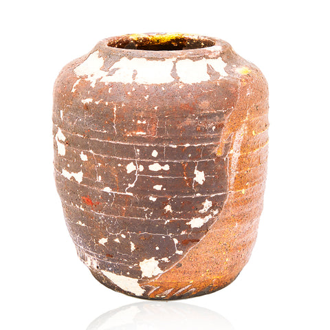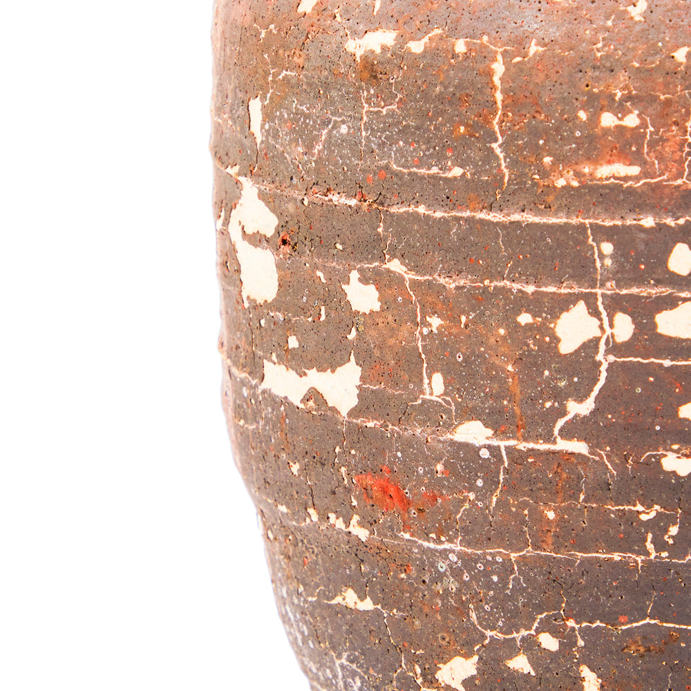 Details: Rustic brown ceramic vase with white speckles and areas of patina Dimensions: 8" H x 7" W x 7" D Quantity: 1