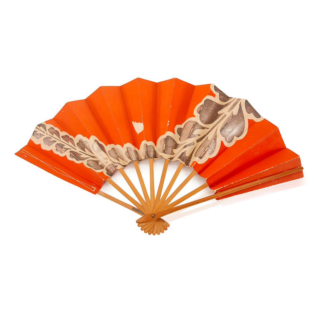 Details: Orange East Asian folding hand fan with a grey floral design Dimensions: 10.5" H x 18" W x 1" D Quantity: 1
