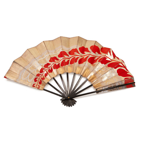 Details: Golden folding hand fan with red curving floral design Dimensions: 10.5" H X 18" W X 1" D