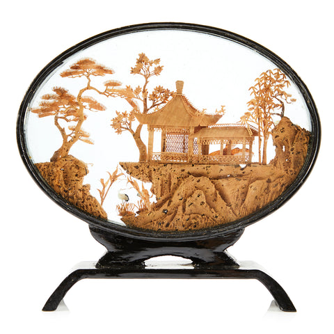 Details: Japanese hillside natural scene of a house and bridge amongst trees carved of wood, encased in clear resin and in a black frame and...