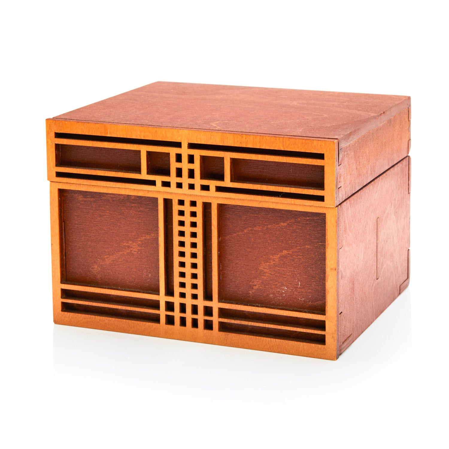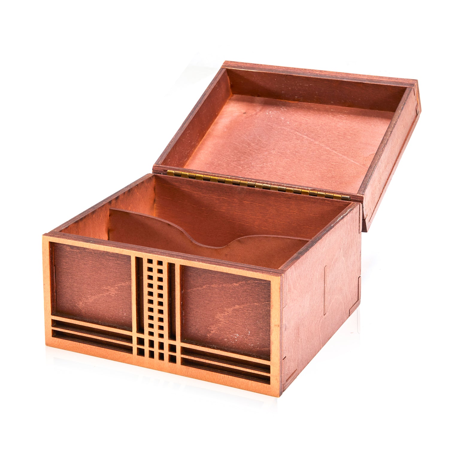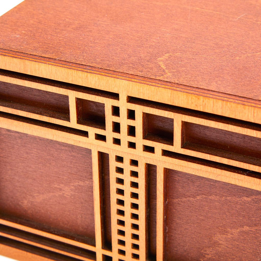 Details: Japanese style wooden box with minimal geometric design on front and interior divider Dimensions: 5" H x 7" W x 6" D Quantity: 1