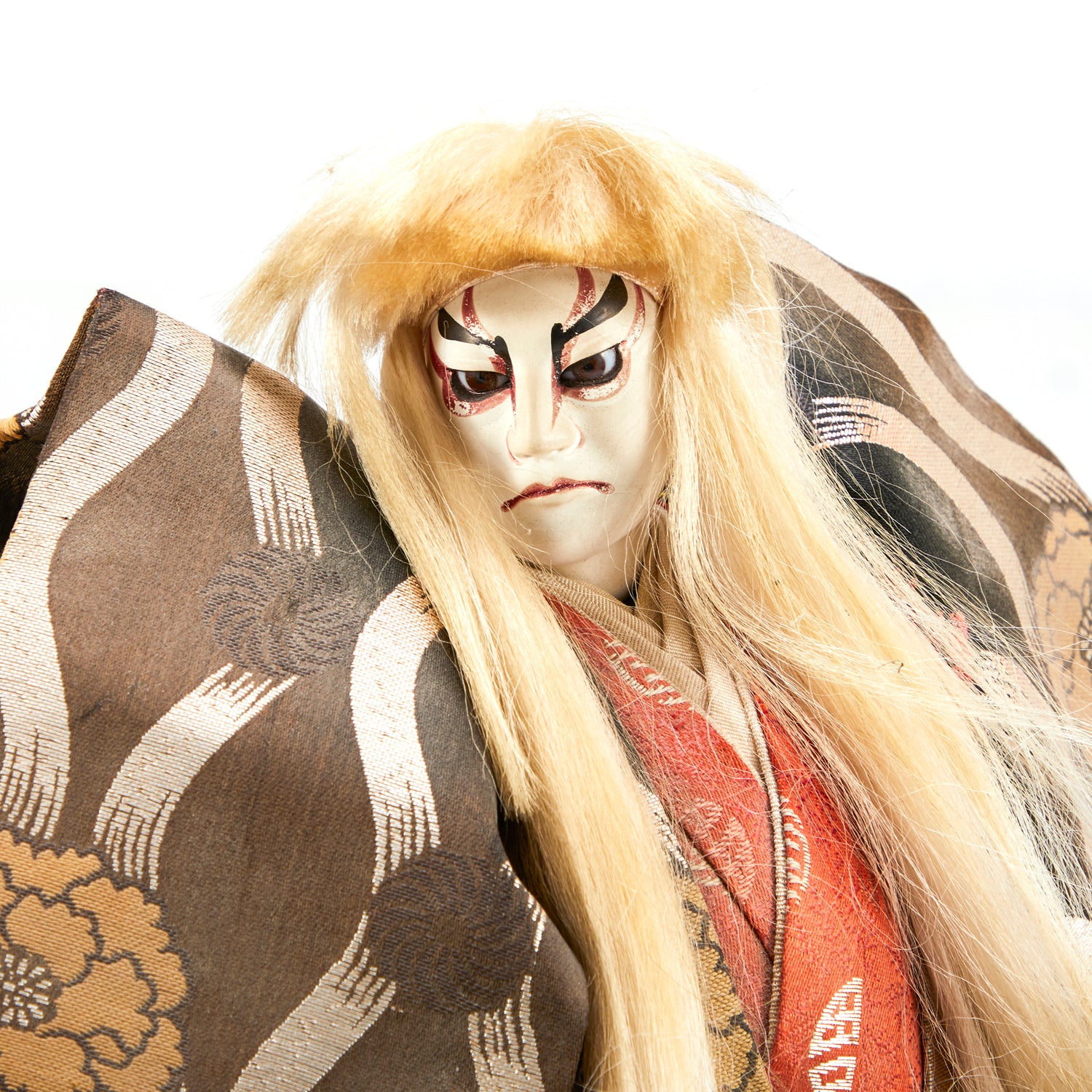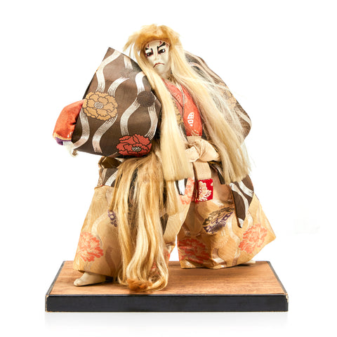 Details: A Japanese Kabuki doll with a brown, tan, and red robe, and long blonde hair on square wood base Dimensions: 15" H x 12"...