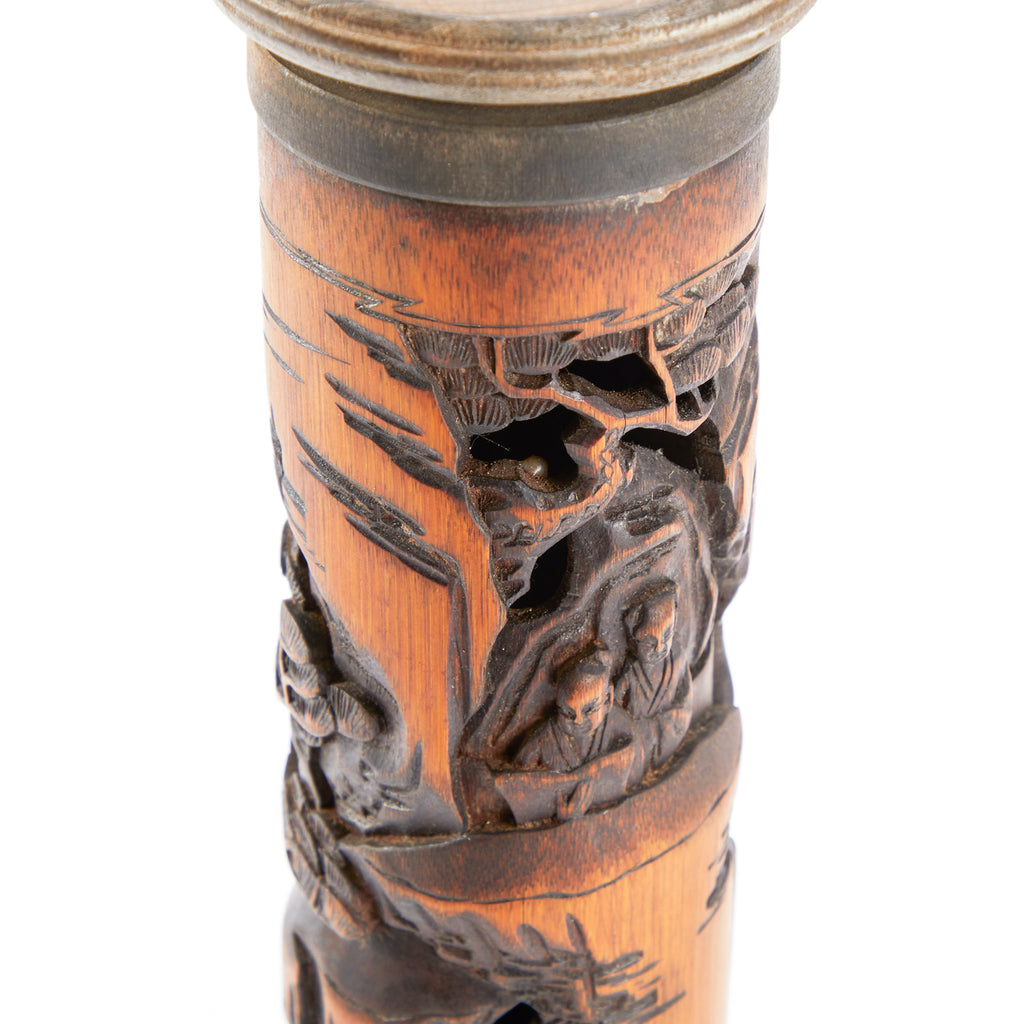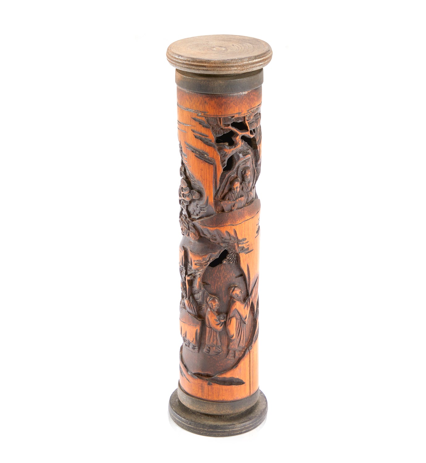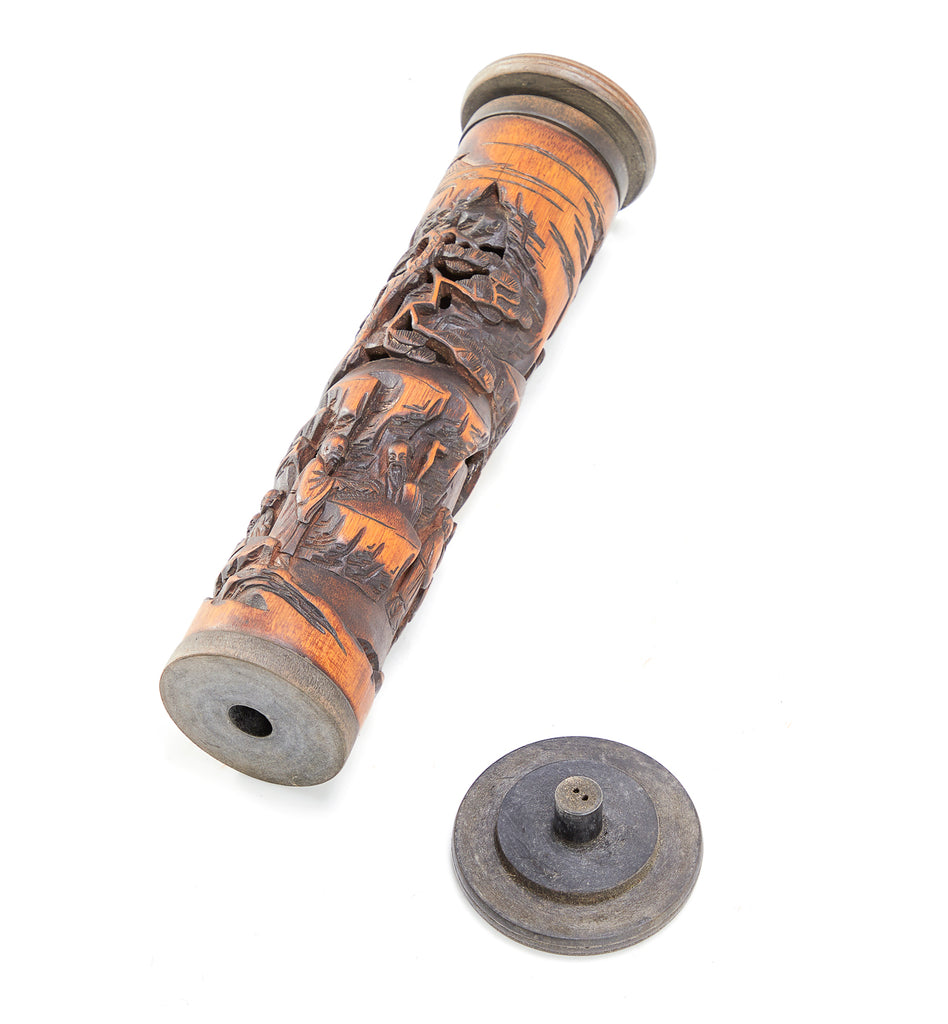 Details: Asian wooden vertical incense burner with cutout folk scene Dimensions: 12" H x 3" W x 3" D Quantity: 1