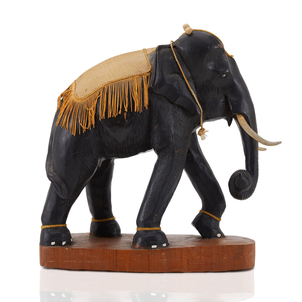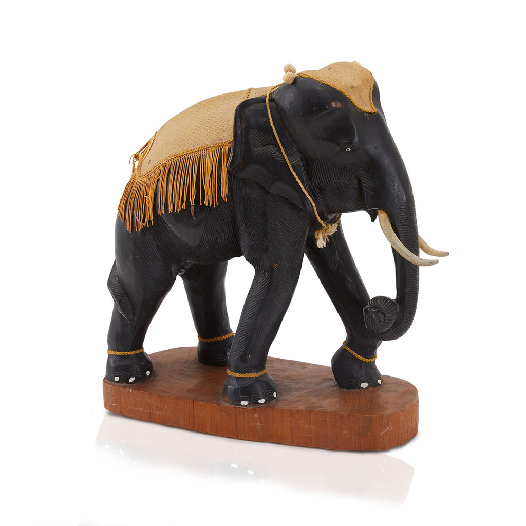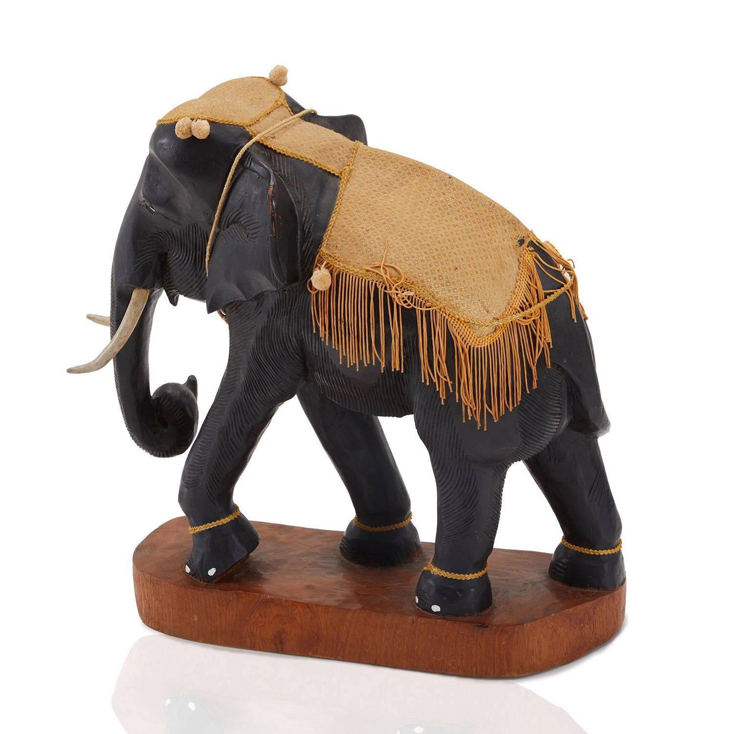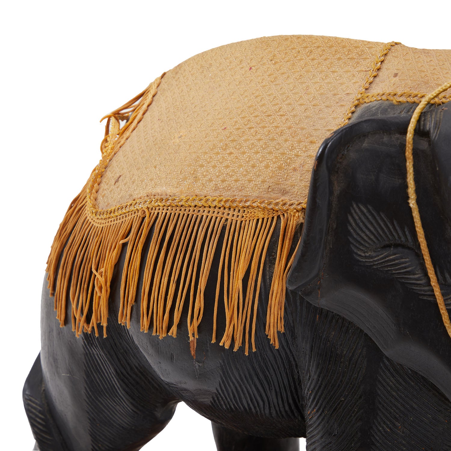 Details: Black painted elephant table sculpture with cloth headdress Dimensions: 19" H x 6" W x 19" D Quantity: 1