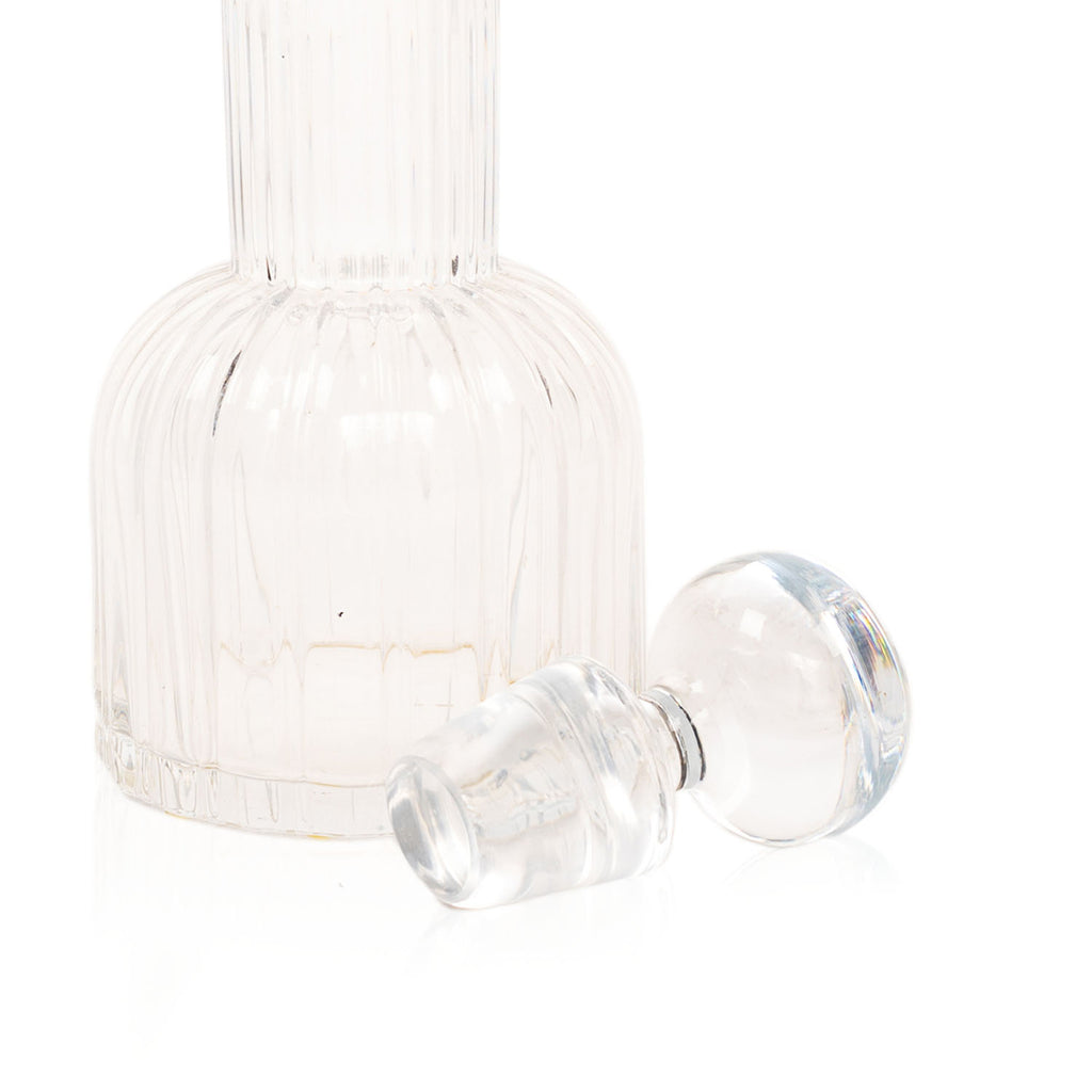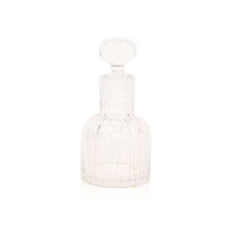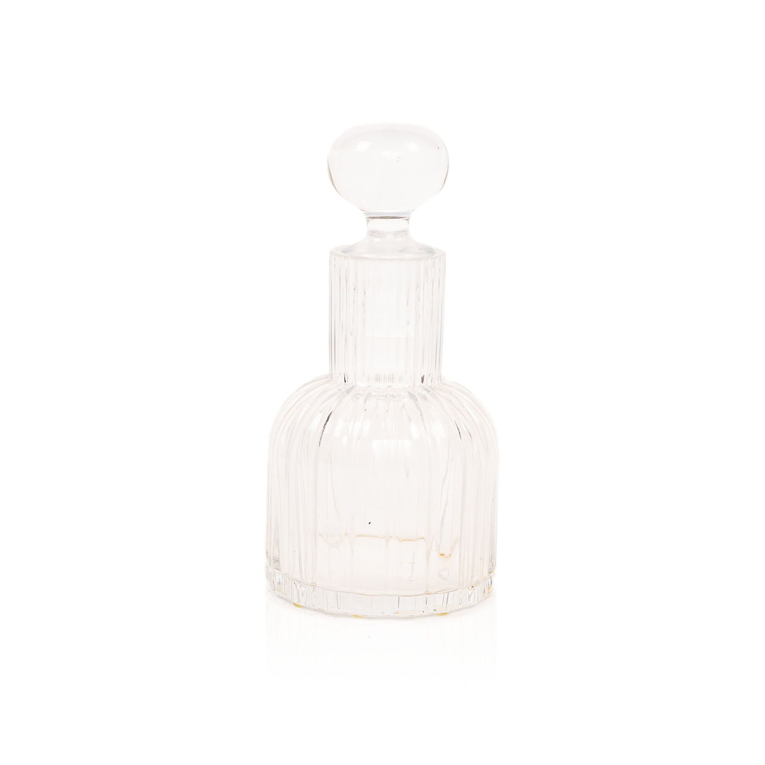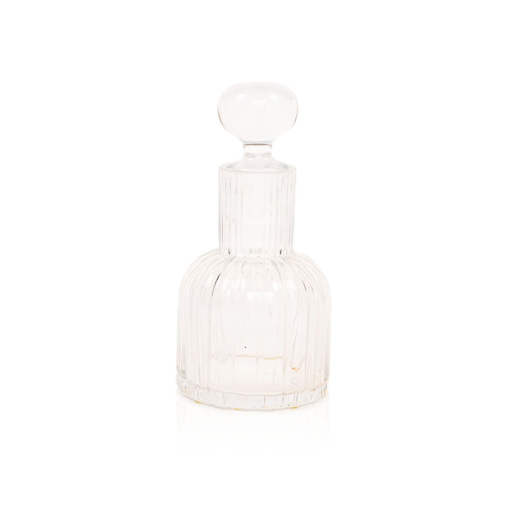 Details: Vintage glass bottle or decanter with ball shaped glass stopper Dimensions: 9" H x 5" W x 5" D Quantity: 1
