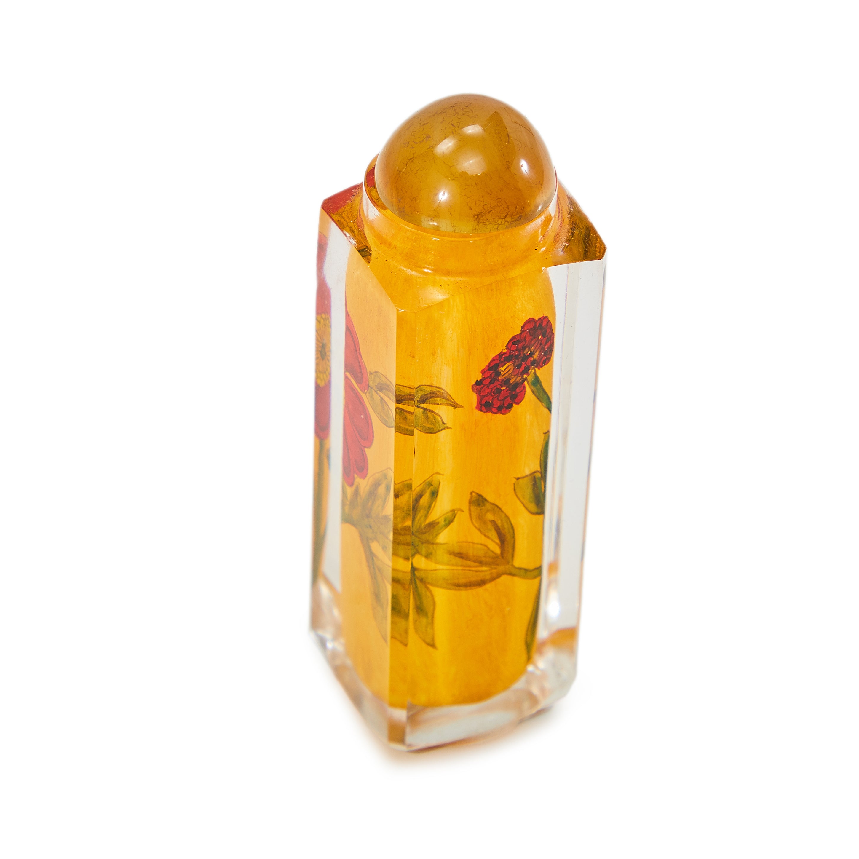 Details: Vintage glass perfume bottle with amber center round stopper, with painted red floral design Dimensions: 3" H x 1" W x 1" D