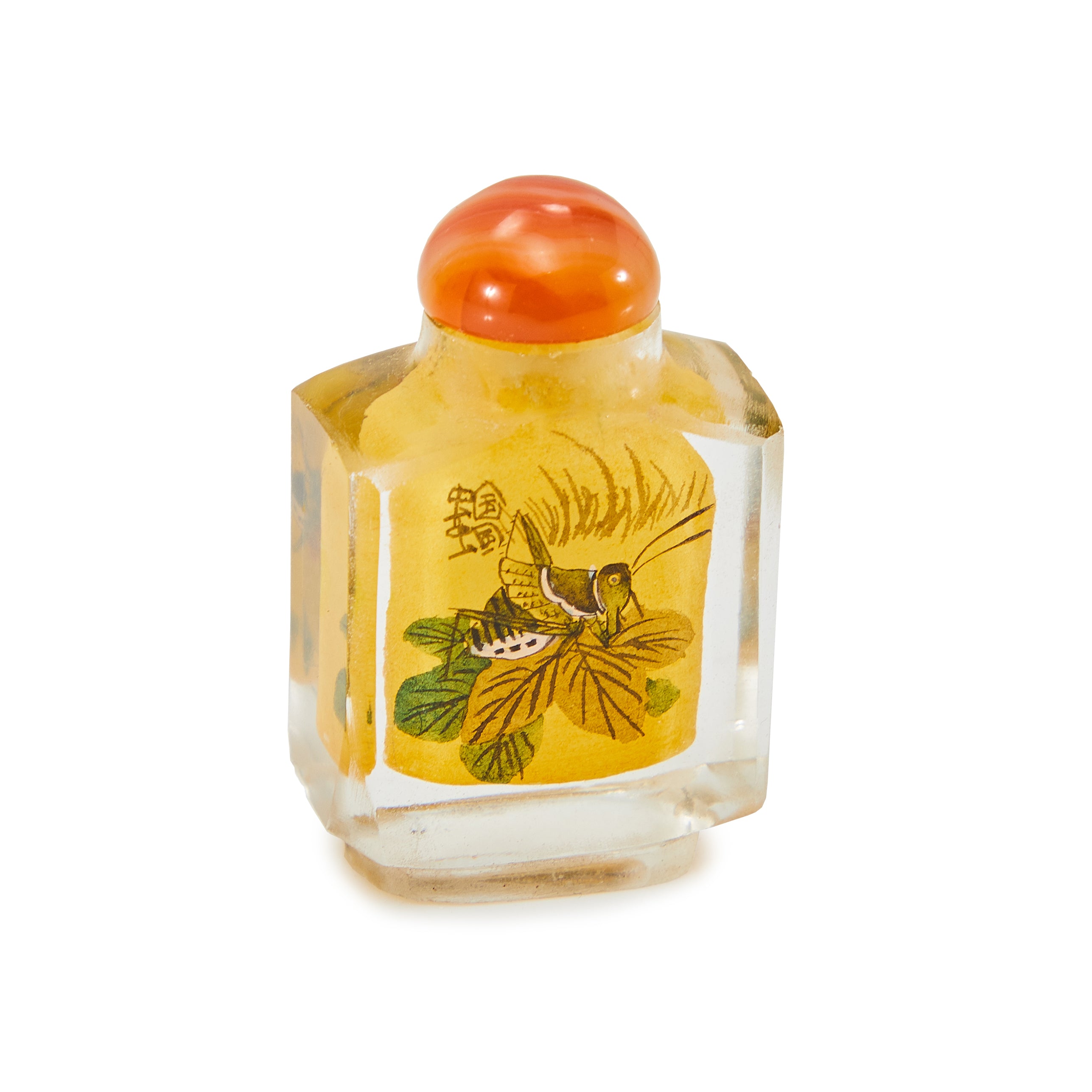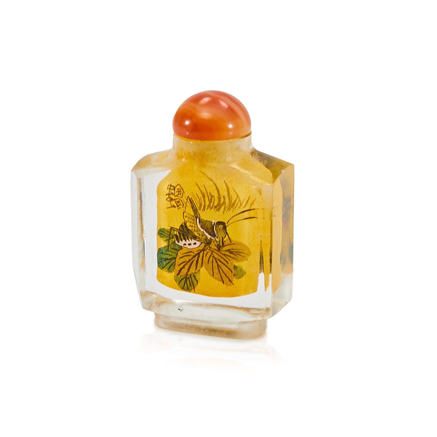 Details: Vintage glass perfume bottle with round orange stopper and painted grasshopper design Dimensions: 2" H x 1.5" W x 0.5" D
