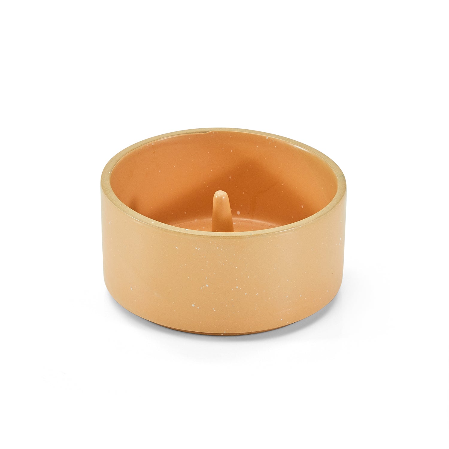 Details: Tiny orange speckled ceramic jewelry dish with center ring holder Dimensions: 2" H x 4.5" D