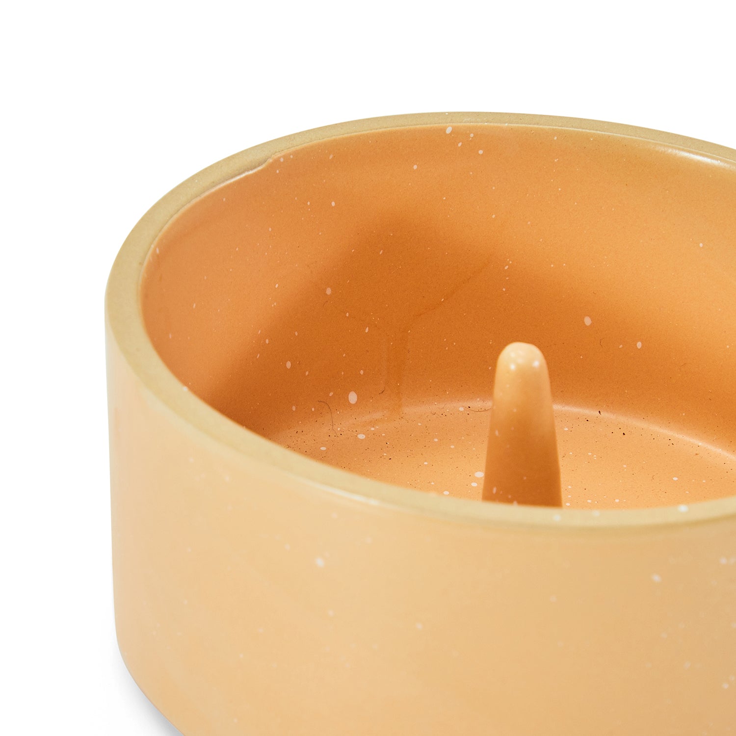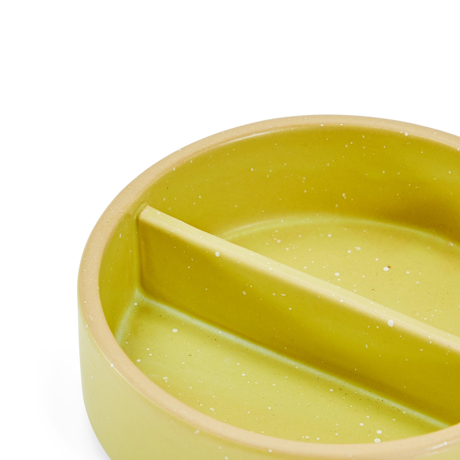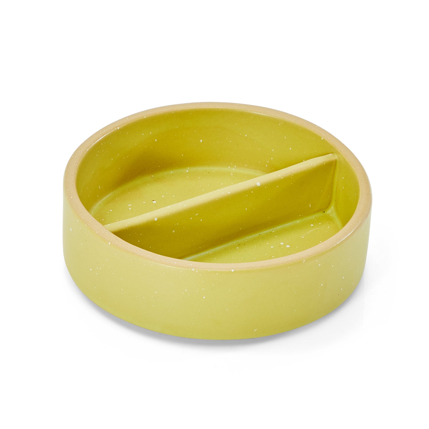 Details: Tiny speckled yellow ceramic jewelry dish with two compartments Dimensions: 1.5" H x 4.5" D