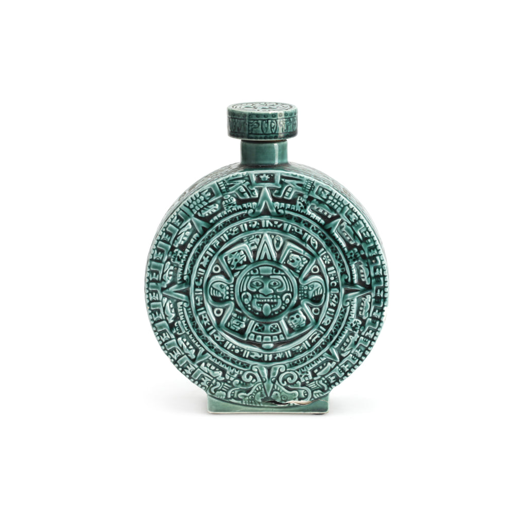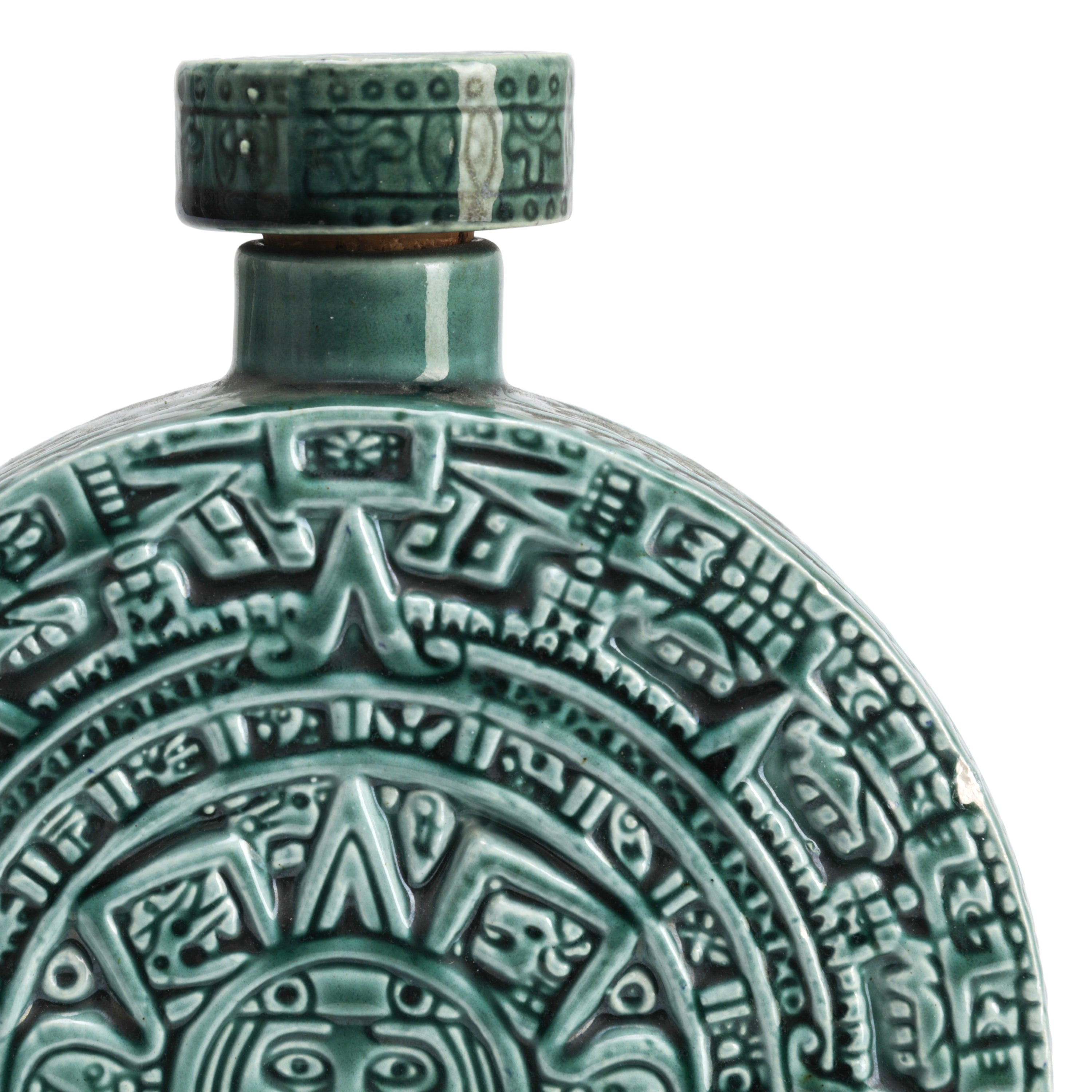 Details: Green flask featuring an Aztec sun stone. Small crack on base. Dimensions: 8.5" H x 7" W x 2" D