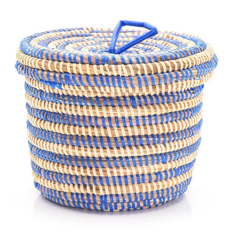 Details: Blue and tan striped woven Moroccan-style basket. Dimensions: 5.5" H x 7" W x 7" D
