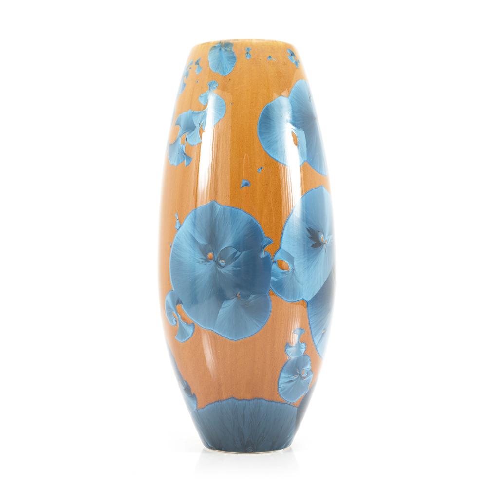 Details: Blue round ceramic vase with ribbed detail. Dimensions: 8" H X 5" W X 5" D