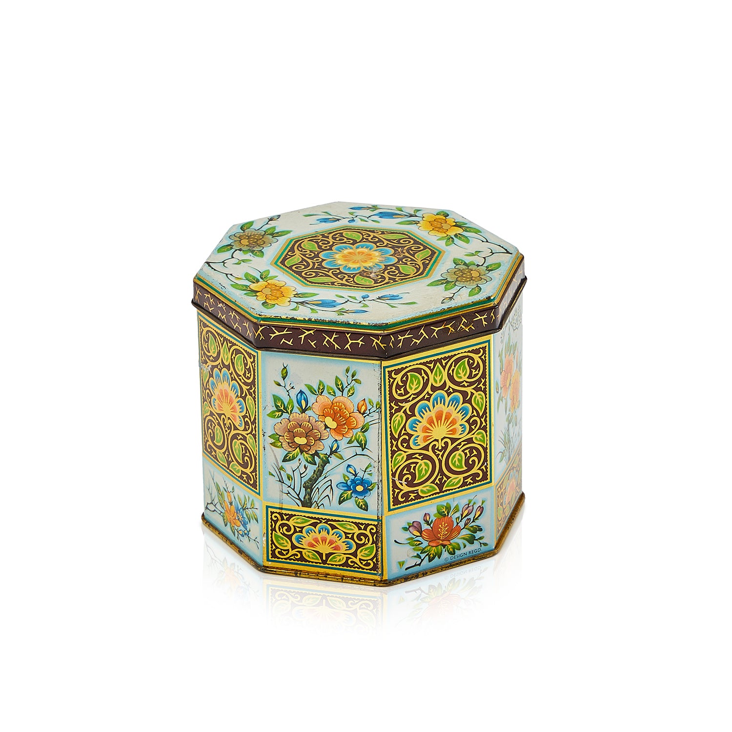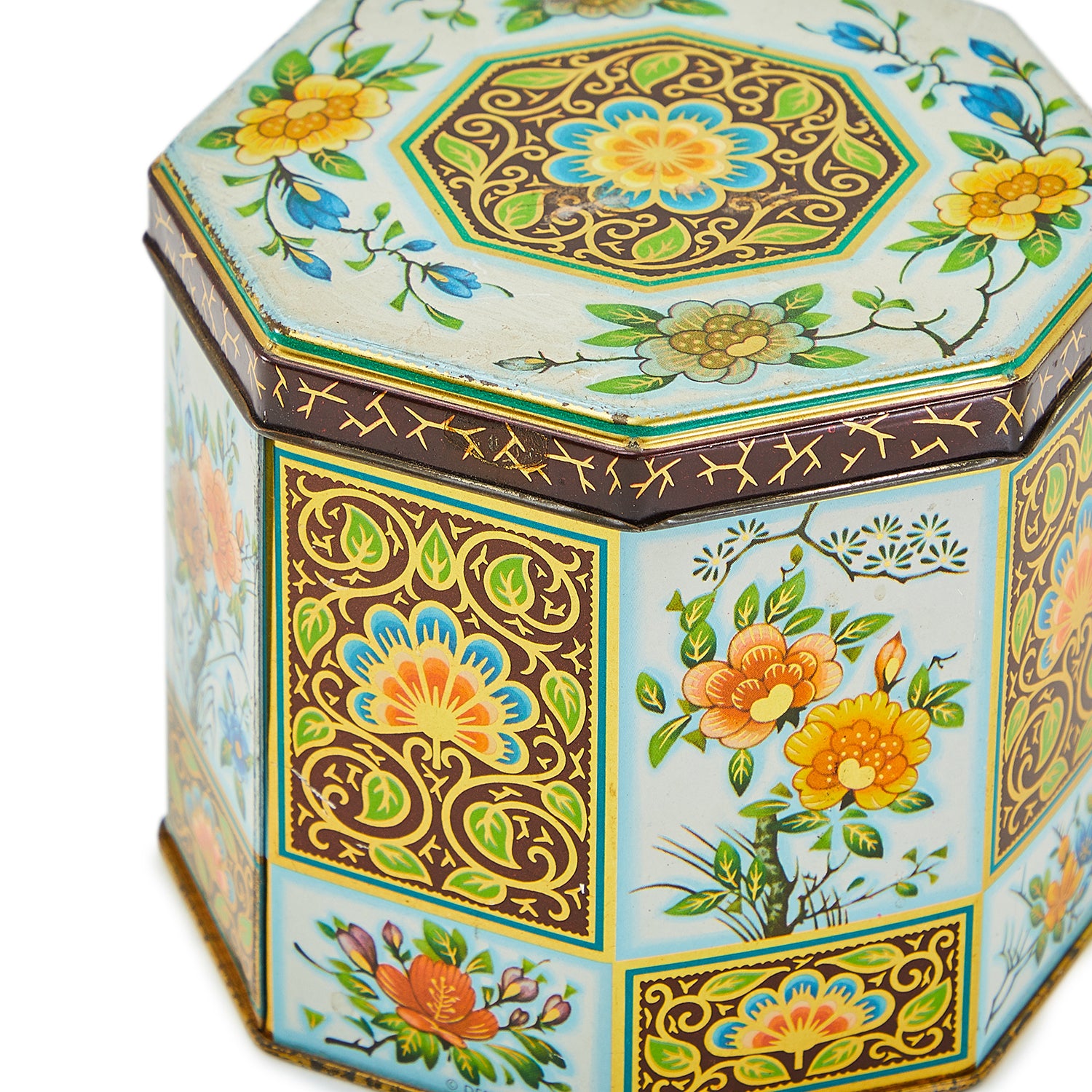 Details: Octagonal tin box with multiple floral patterns Dimensions: 4" H x 4.5" W x 4.5" D
