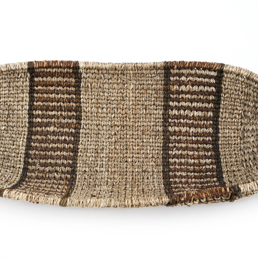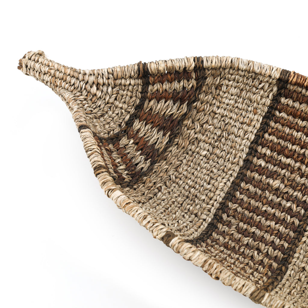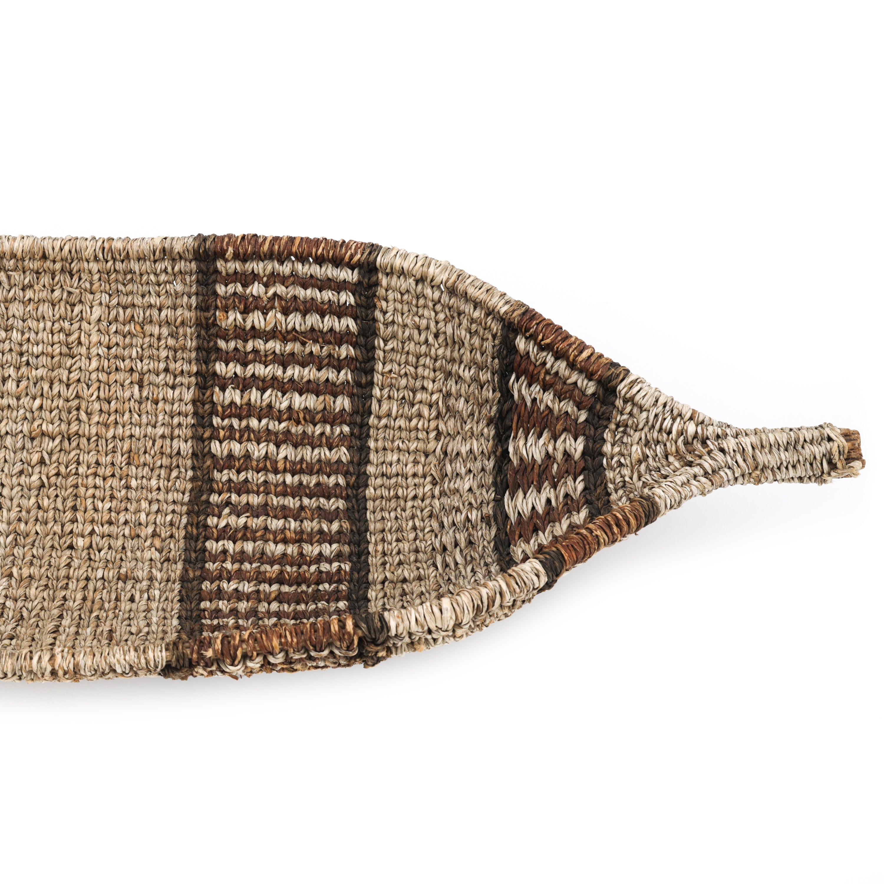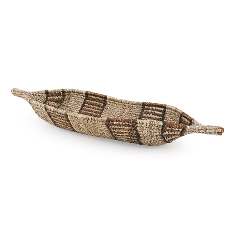 Details: Brown and tan wicker bowl shaped like a boat. Dimensions: 3" H x 22" W x 7" D