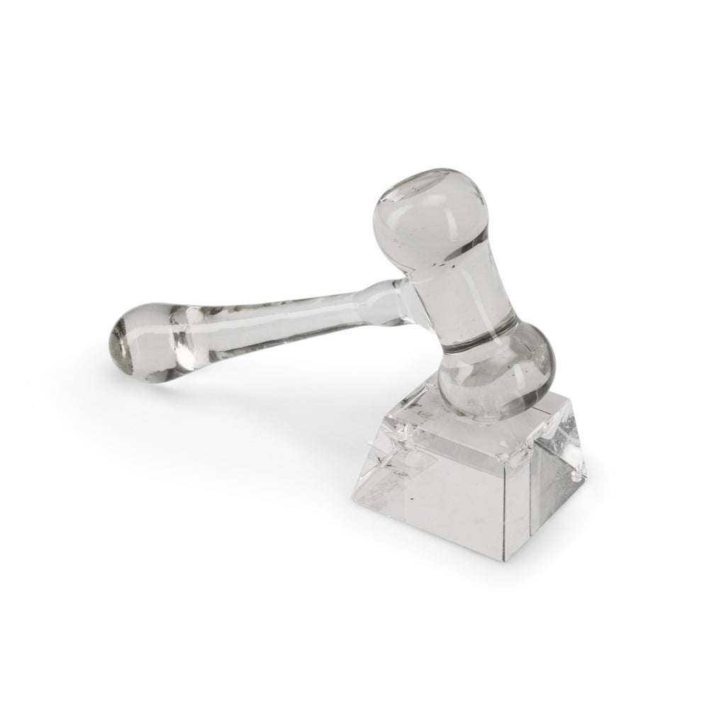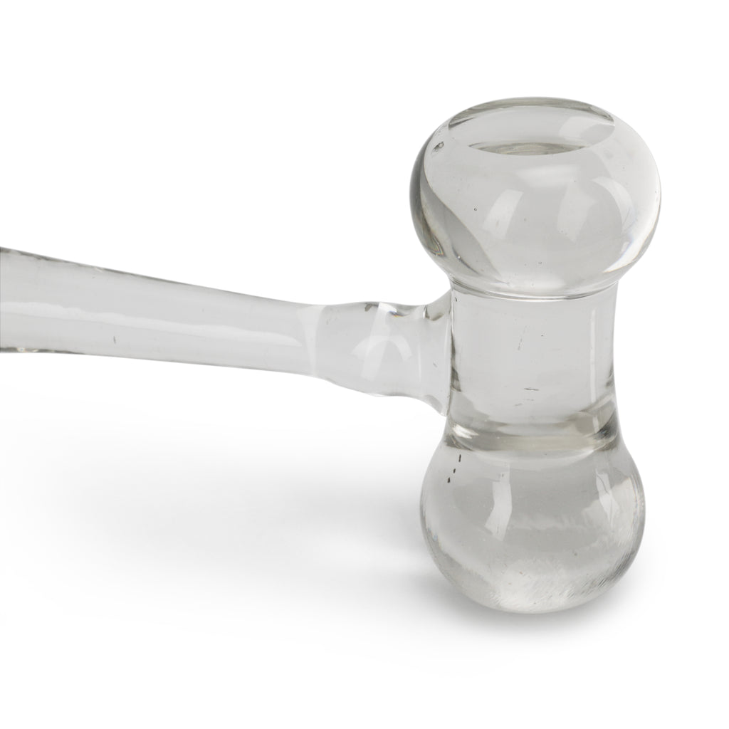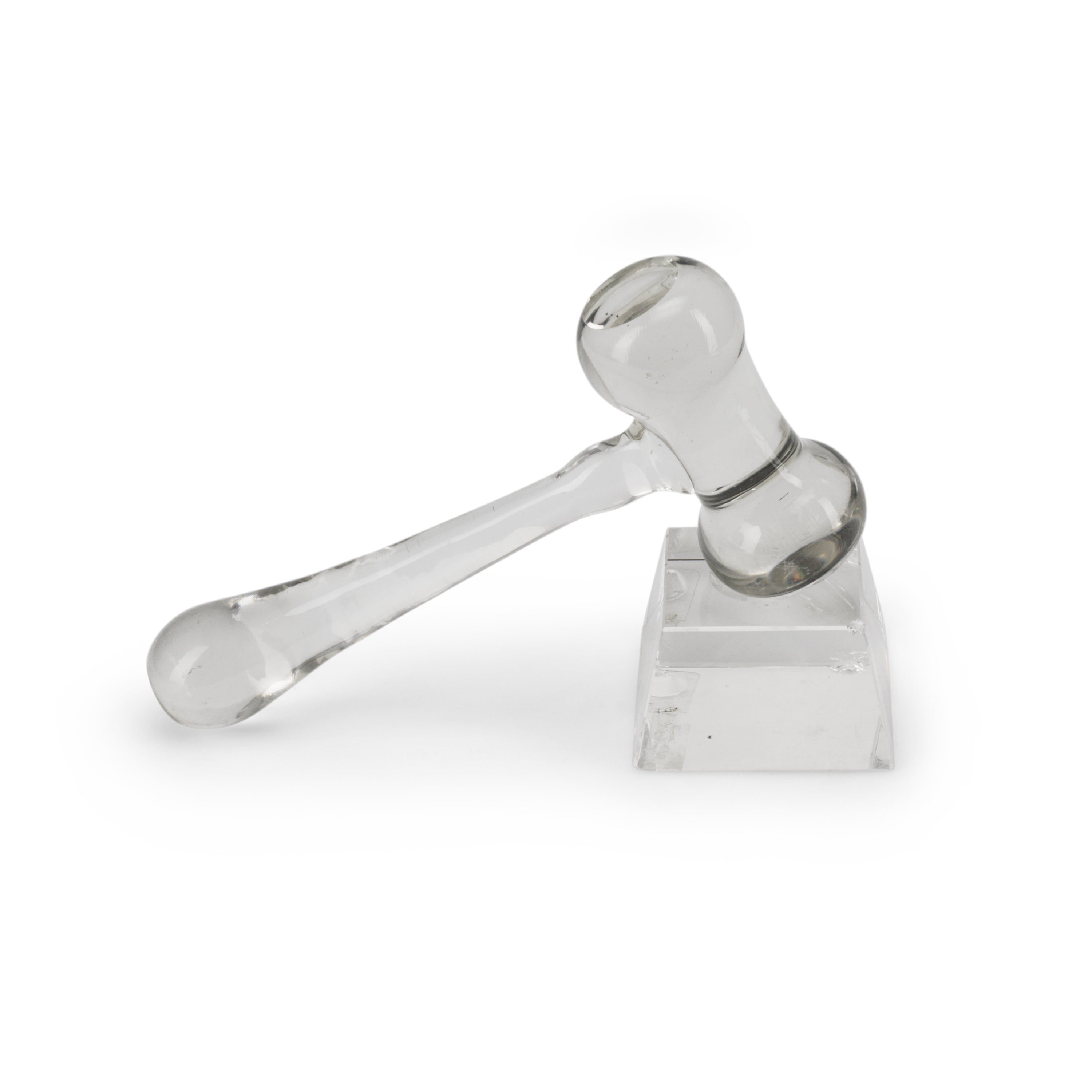 Details: Glass hammer with dimpled stand. Some noticeable wear. Dimensions: 4" H x 5" W x 2" D