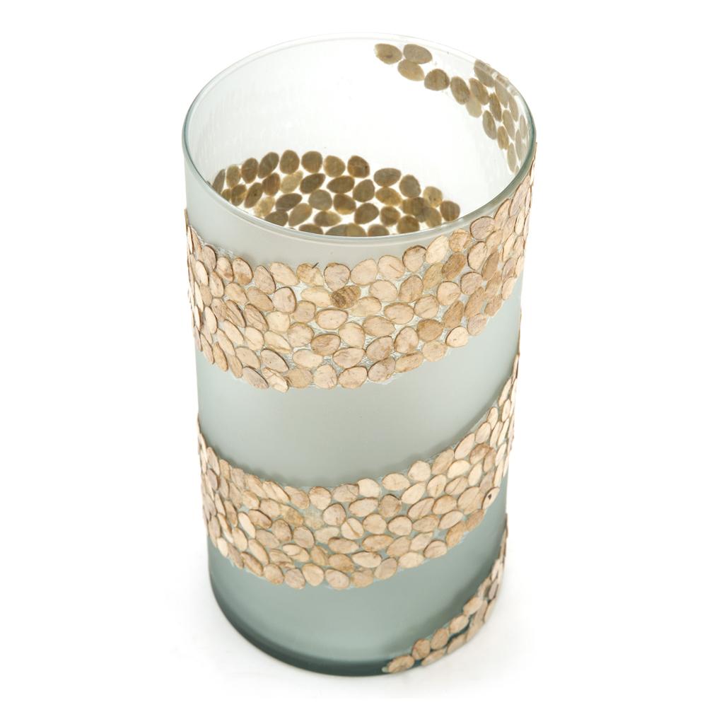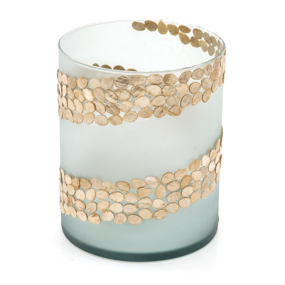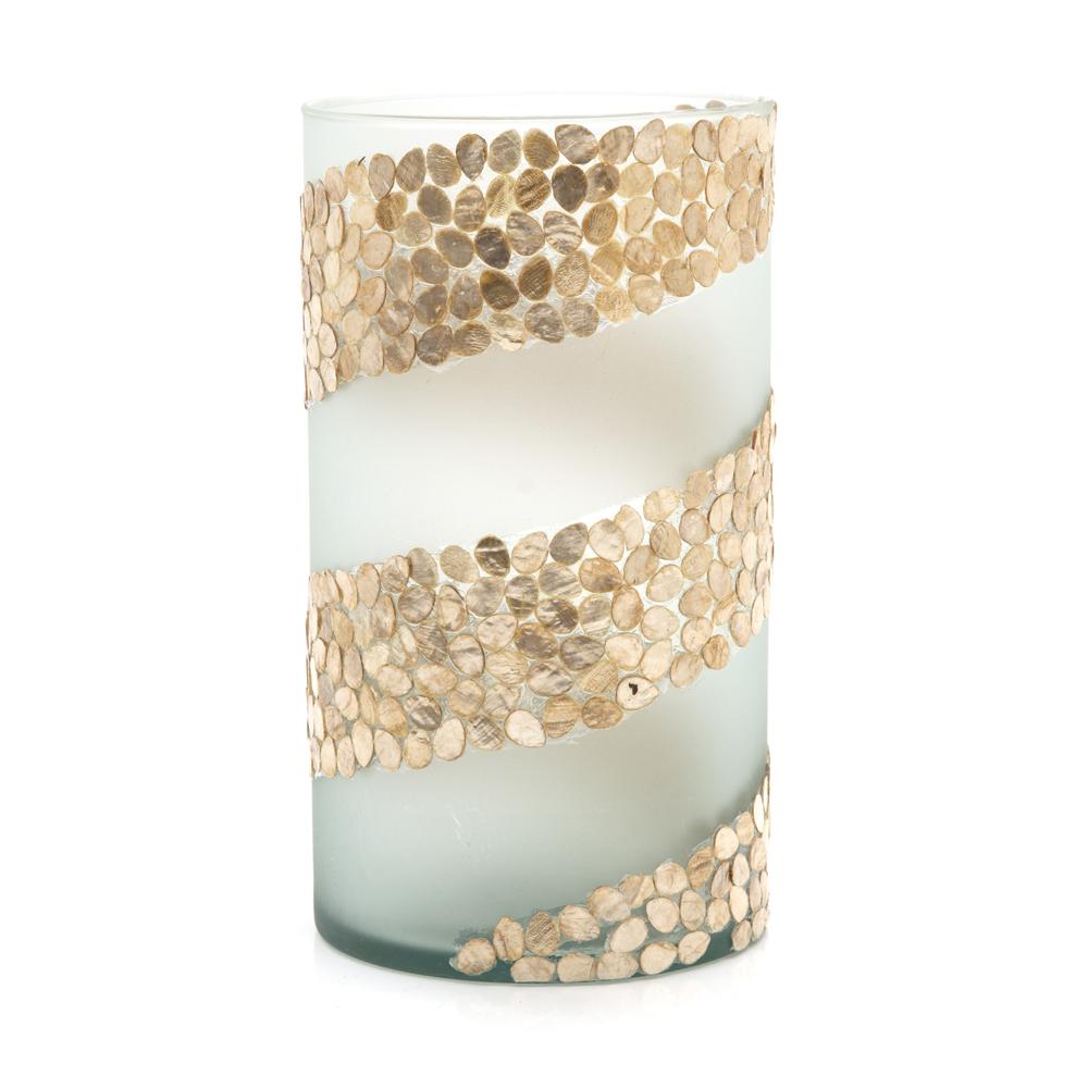 Details: Glass gold striped cylinder. Dimensions: 6" H x 5" W 5" D