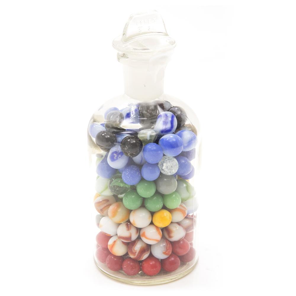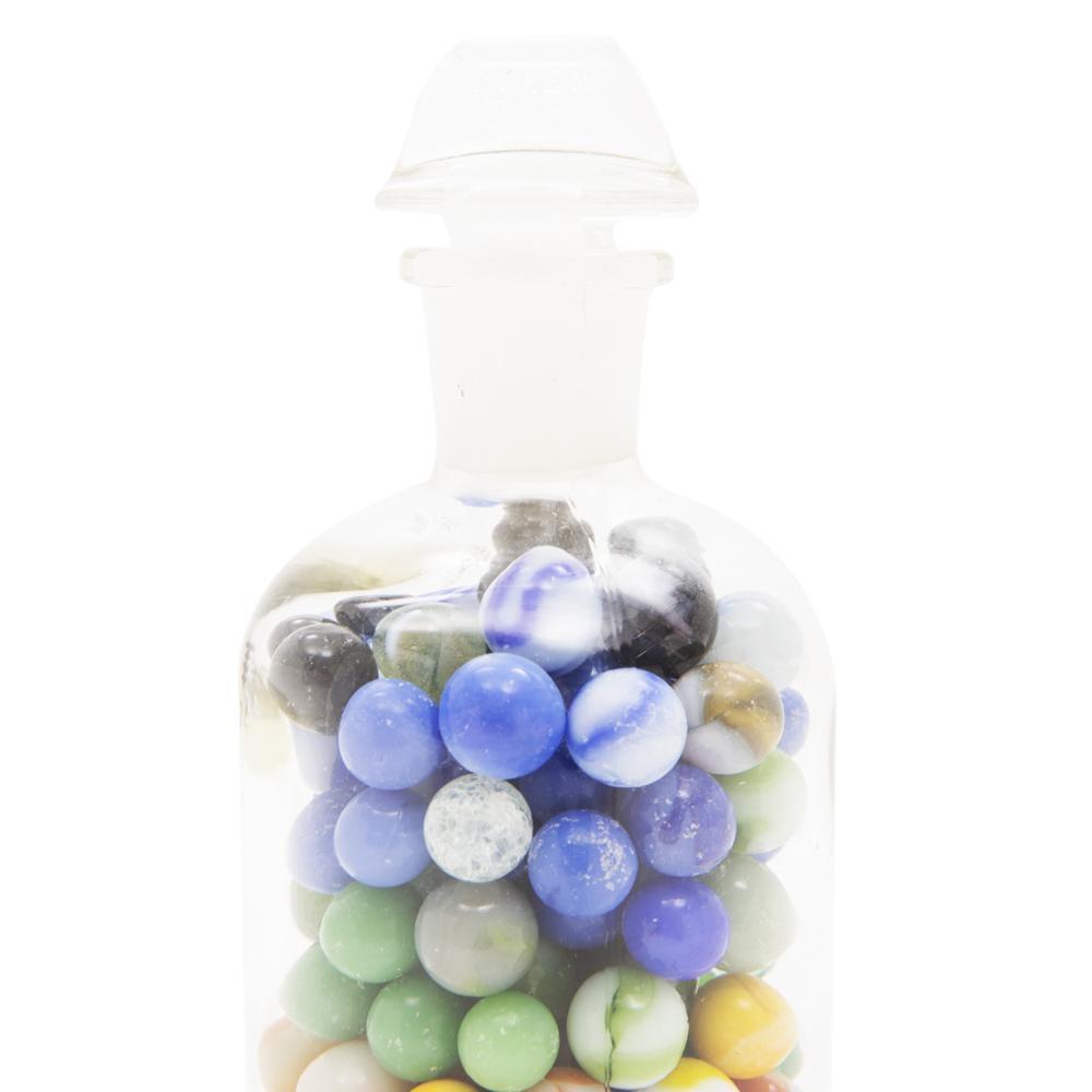 Details: Glass jar of multicolored marbles with removeable top Dimensions: 8.5" H x 3" W x 3" D