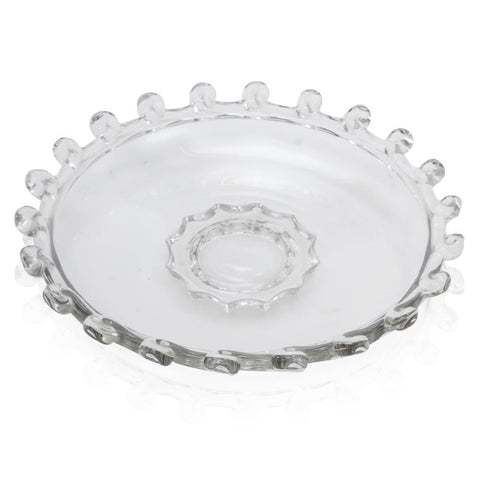 Details: Clear glass serving platter with curly designed edges. Dimensions: 3" H x 14.5" W x 14.5" D