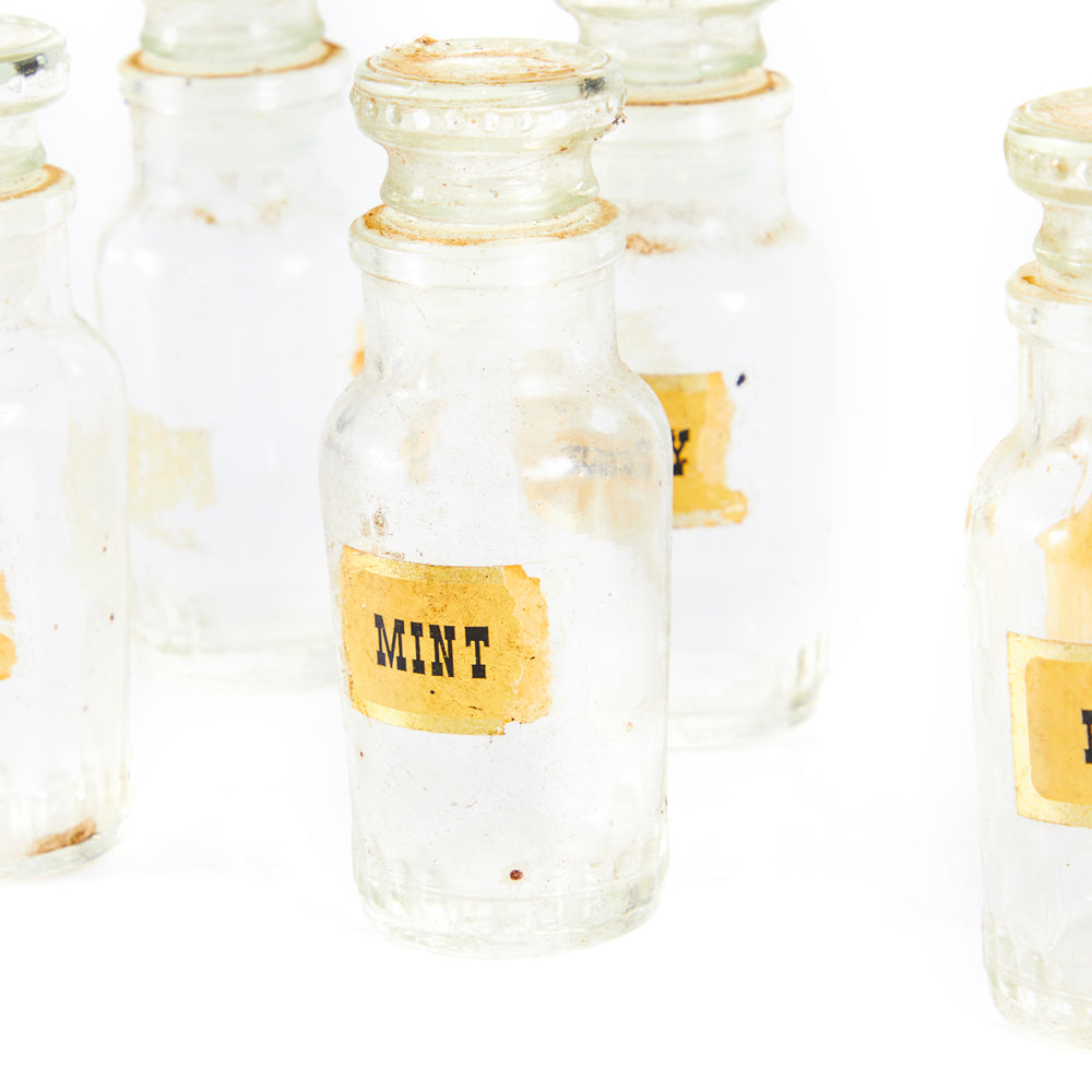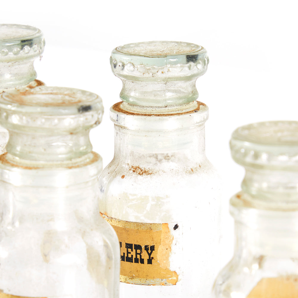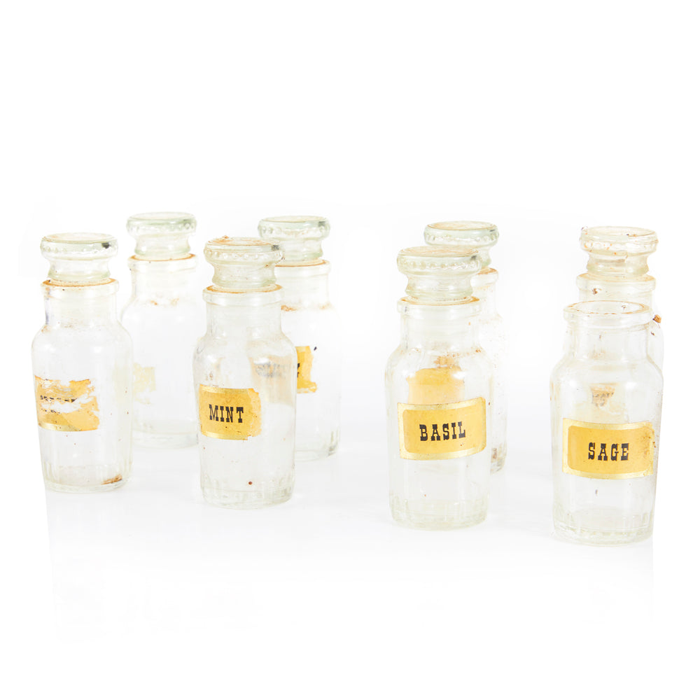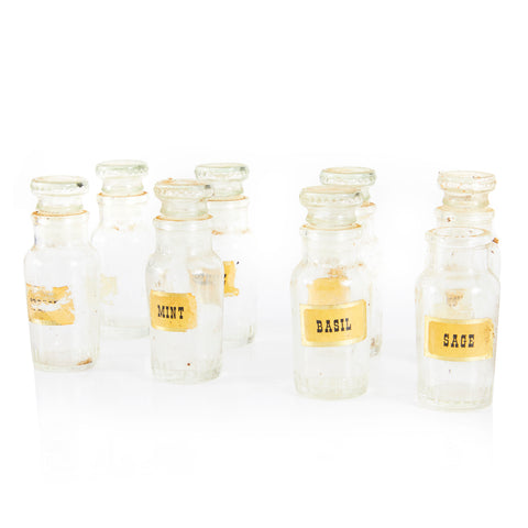 Details: Vintage glass containers for spices with labels in an old west style font Dimensions: 4.25" H x 2" W x 2" D Quantity: 8