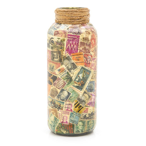 Details: Multicolored jar decorated vintage stamps and rope. Dimensions: 9" H x 3.5" W x 3.5" D