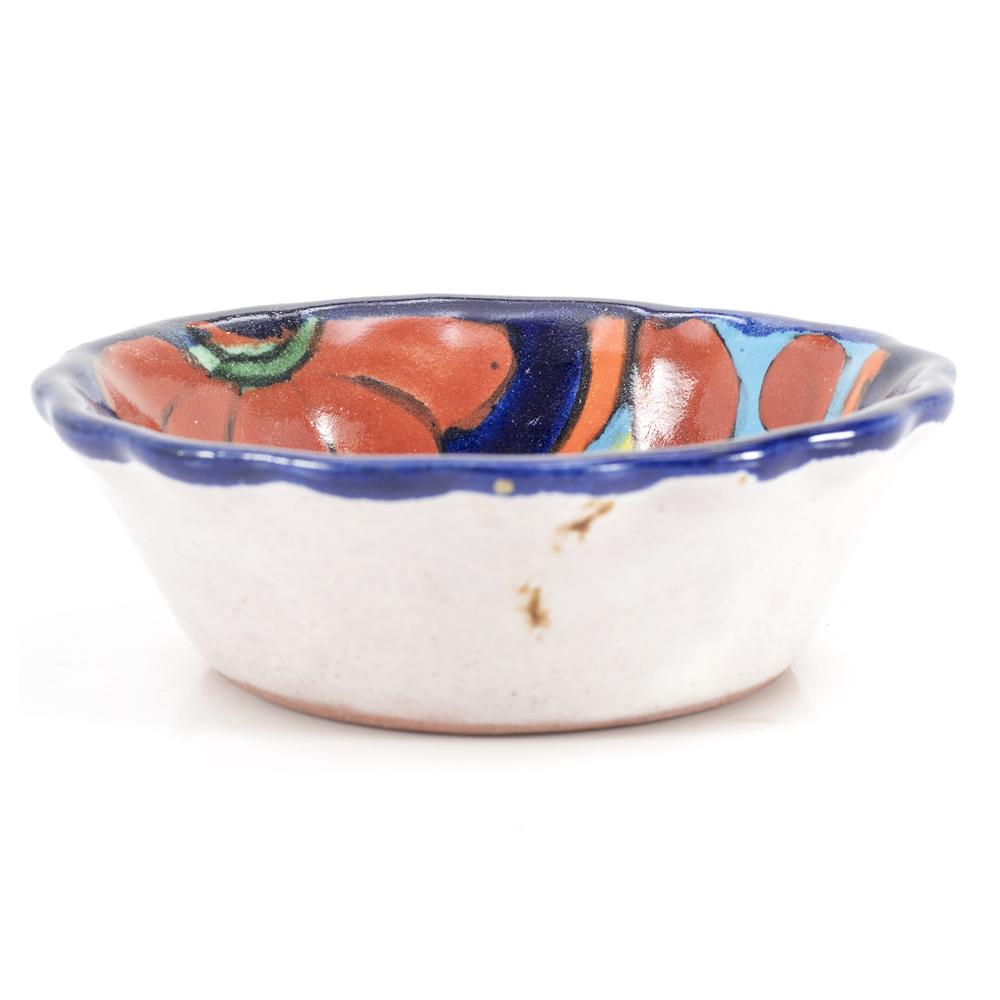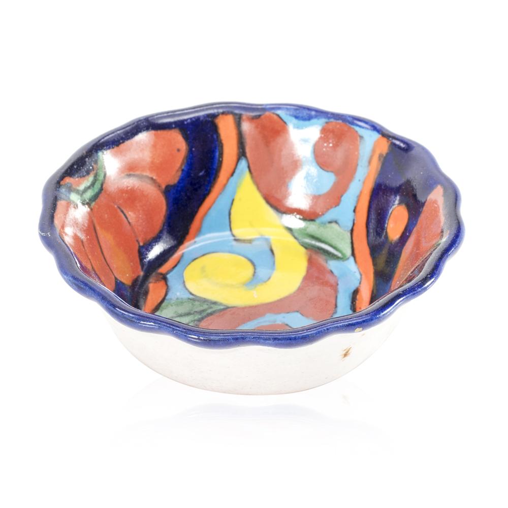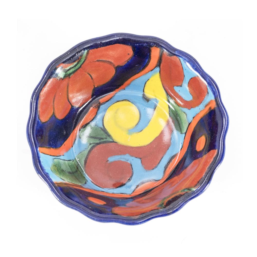 Details: Psychedelic round glazed bowl with ruffle edges. Dimensions: 1" H x 4" W x 4" D