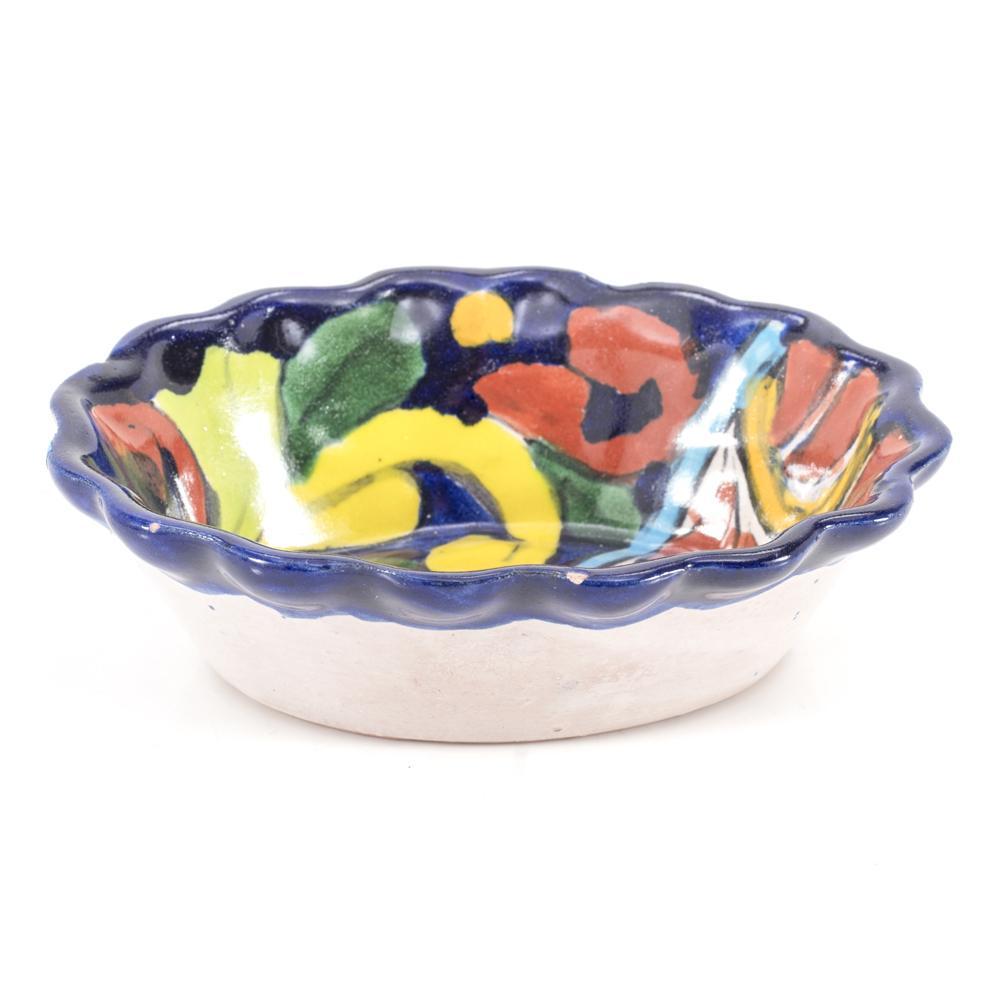 Details: Psychedelic oval glazed bowl with ruffle edges. Dimensions: 2" H x 4" W x 5" D