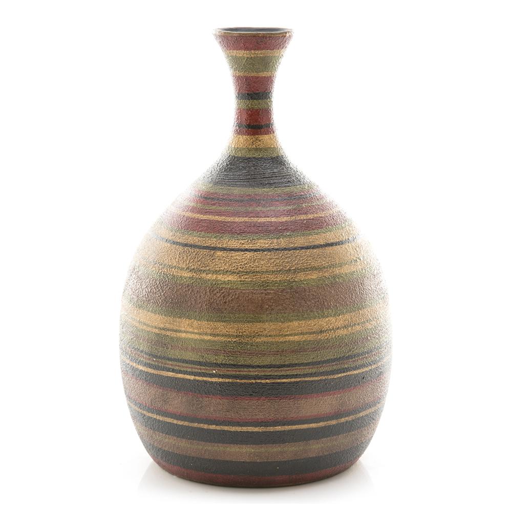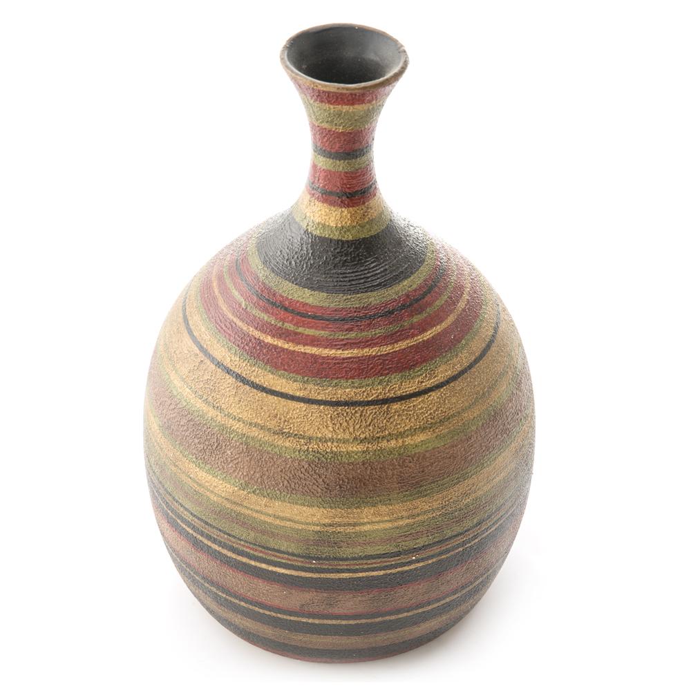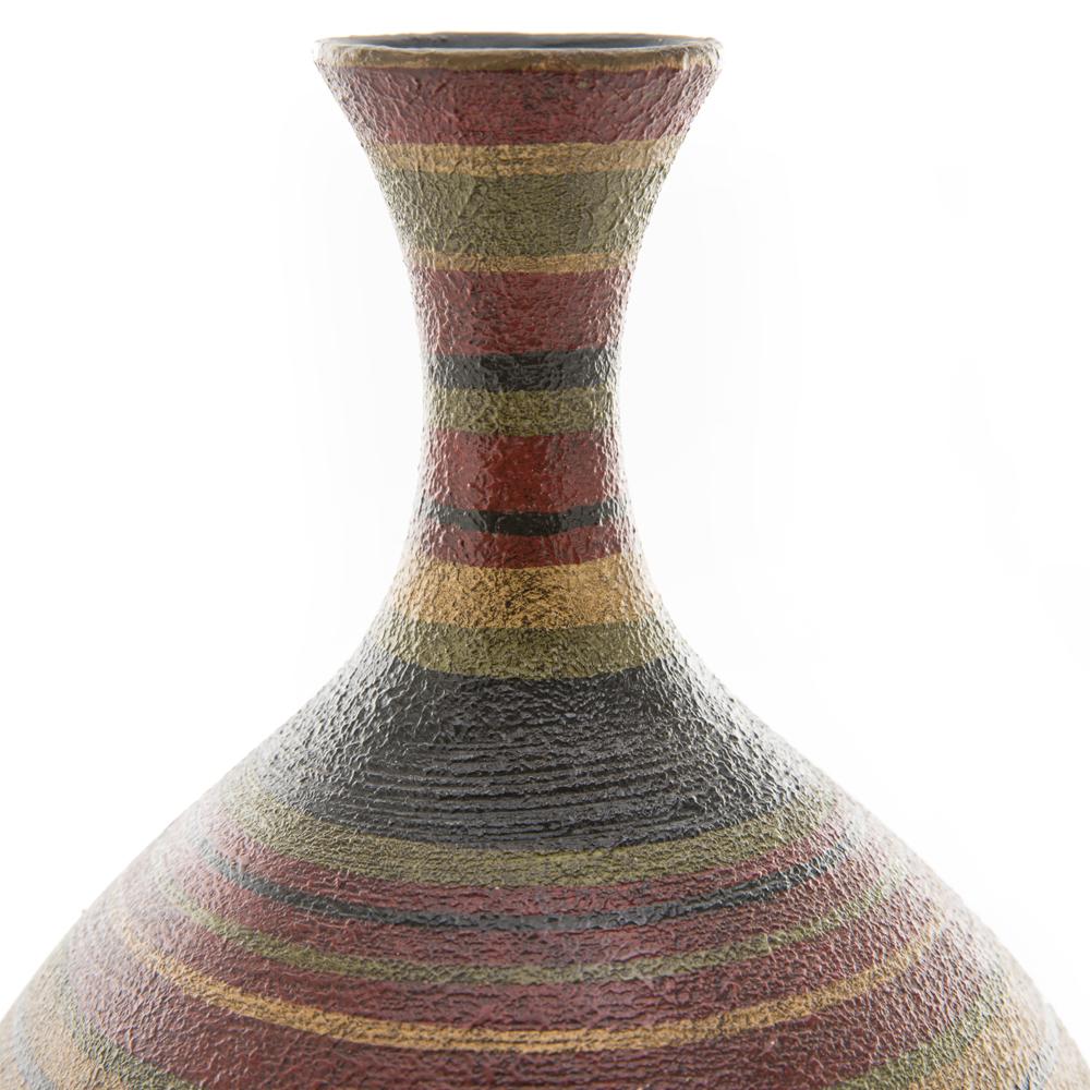 Details: Iron finished vase with gold, red, green, and black stripes. Dimensions: 12" H x 6" W x 6" D