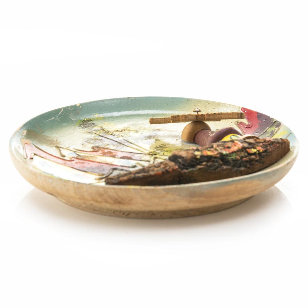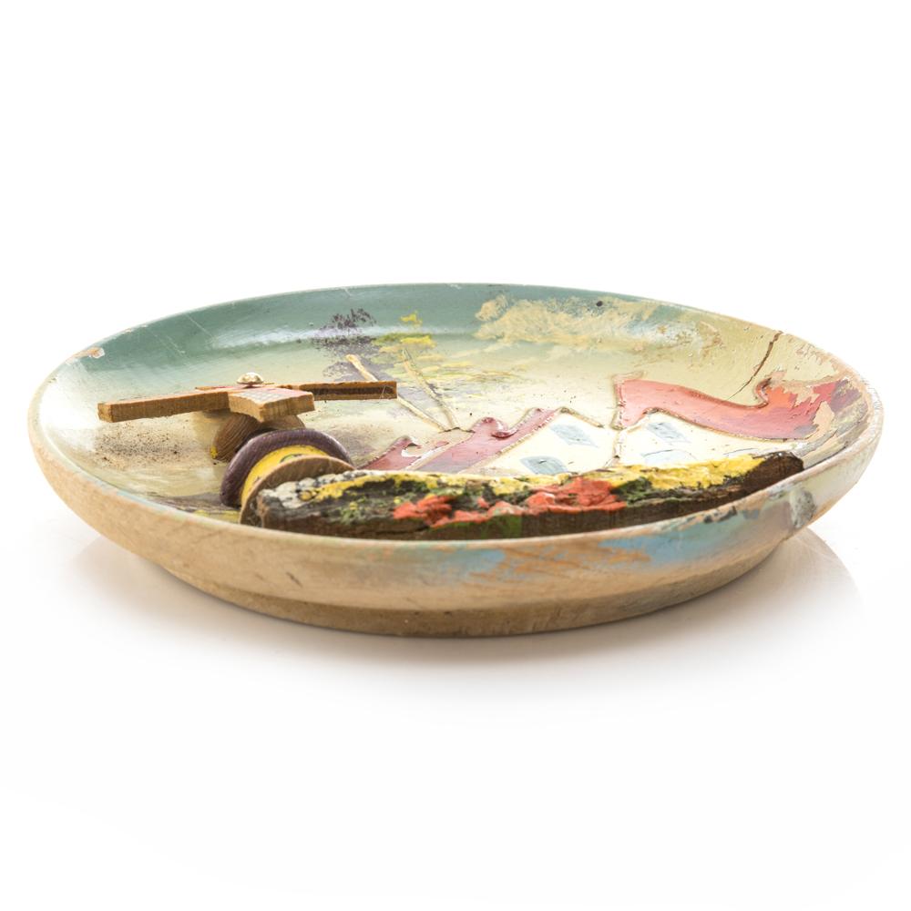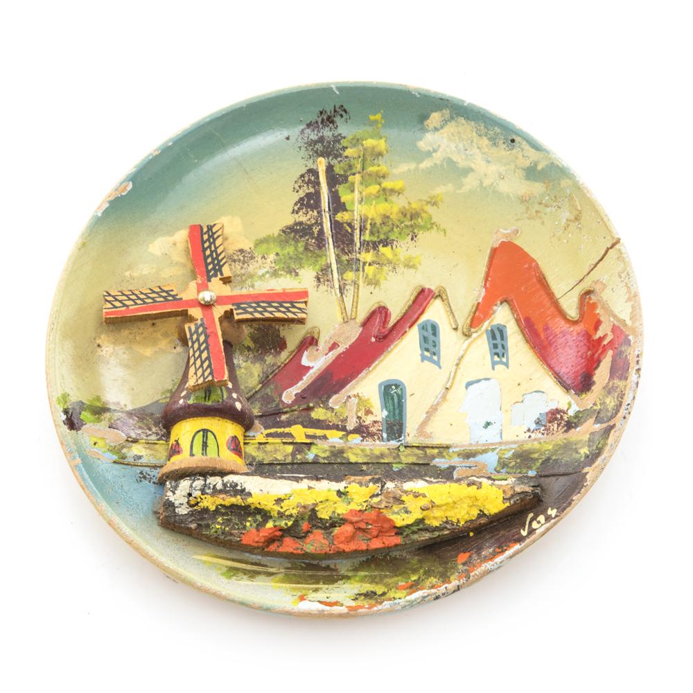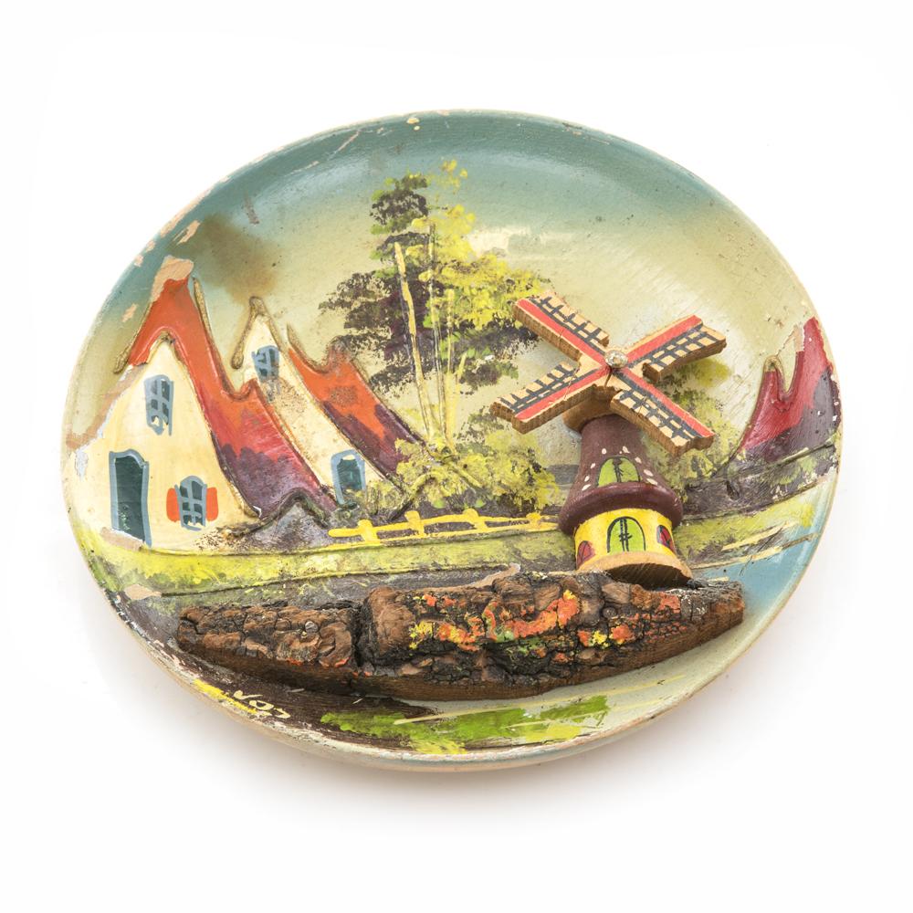 Details: Multicolored wooden decorative plate with windmill. Dimensions: 5" H x 8" W x 3" D