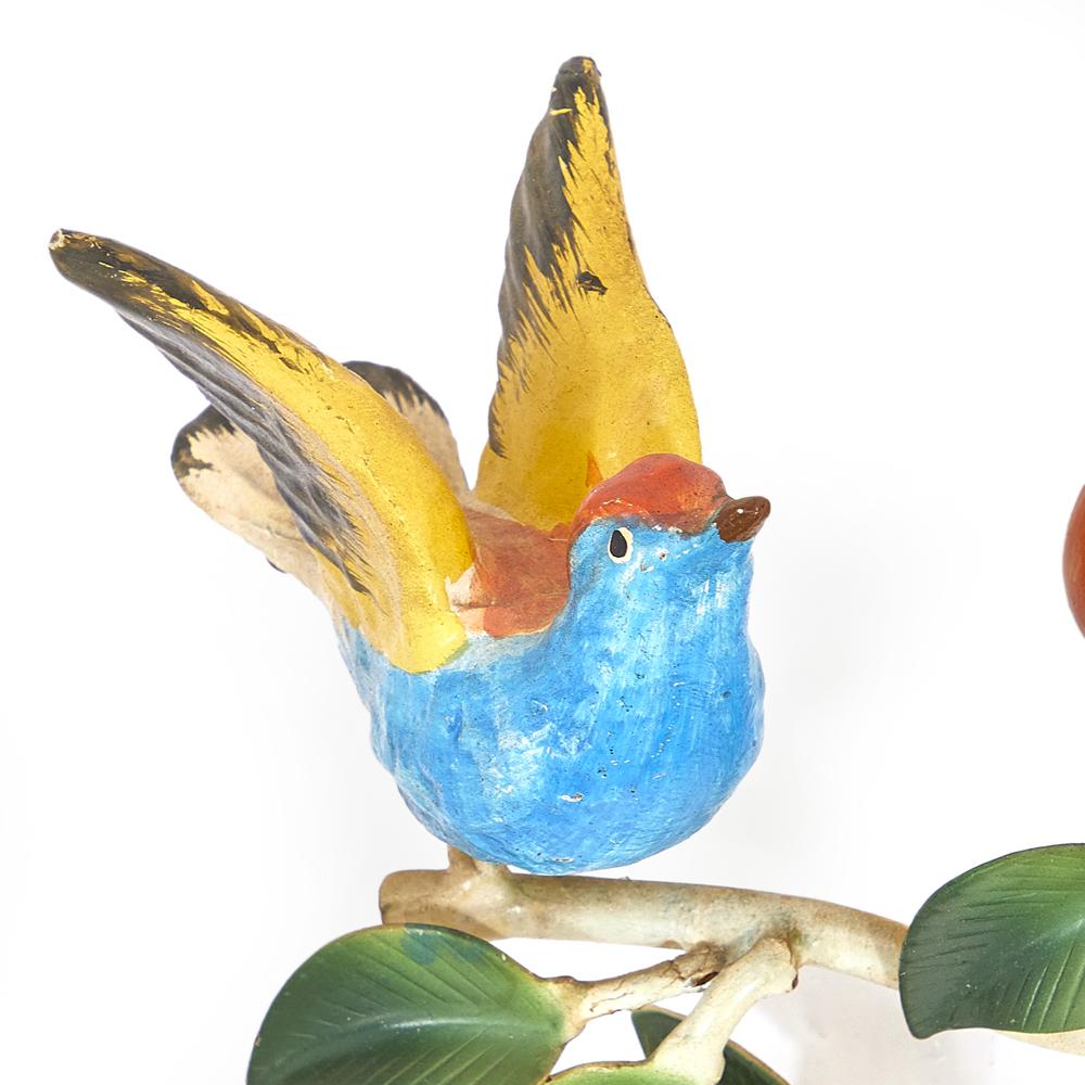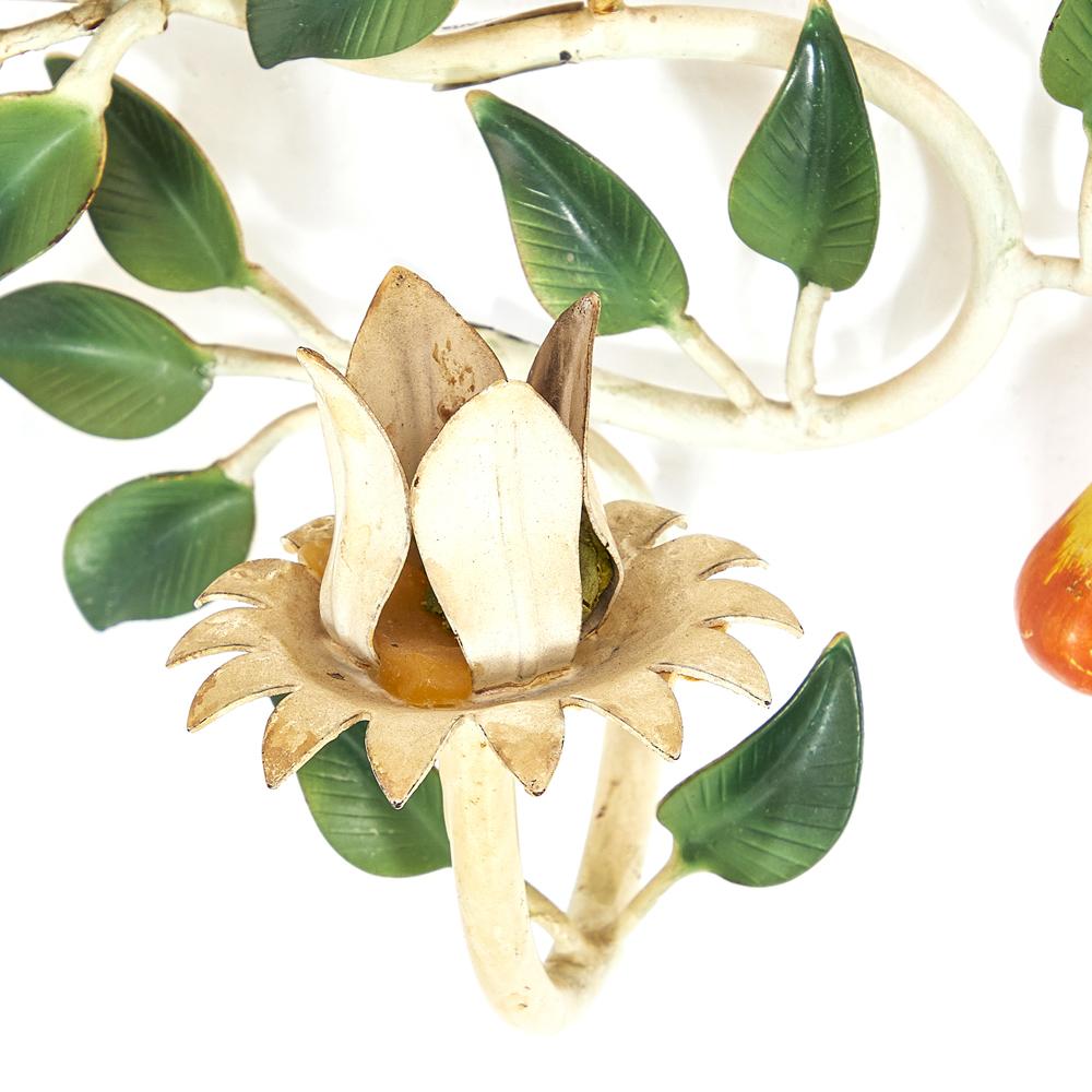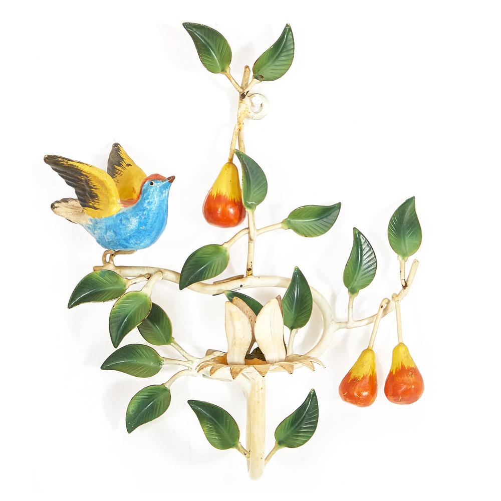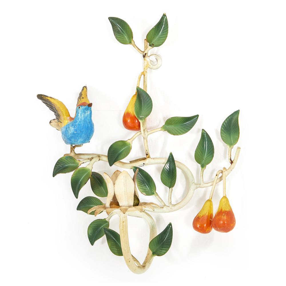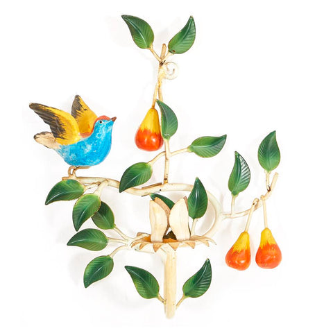 Details: Painted metal mount with bird, leaves, flowers and hanging fruit Dimensions: 11" H x 9" W x 4.75" D Quantity: 1