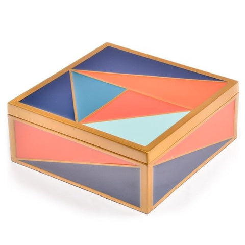 Details: Geometric triangular patterned jewelry box with light blue, dark blue, orange, and gold trimDimensions: 2" H x 5" W x 5" D
