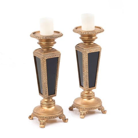 Details: Black and gold neo-classical candle stick holders Dimensions: 11" H x 5" W x 5" D Quantity: 2