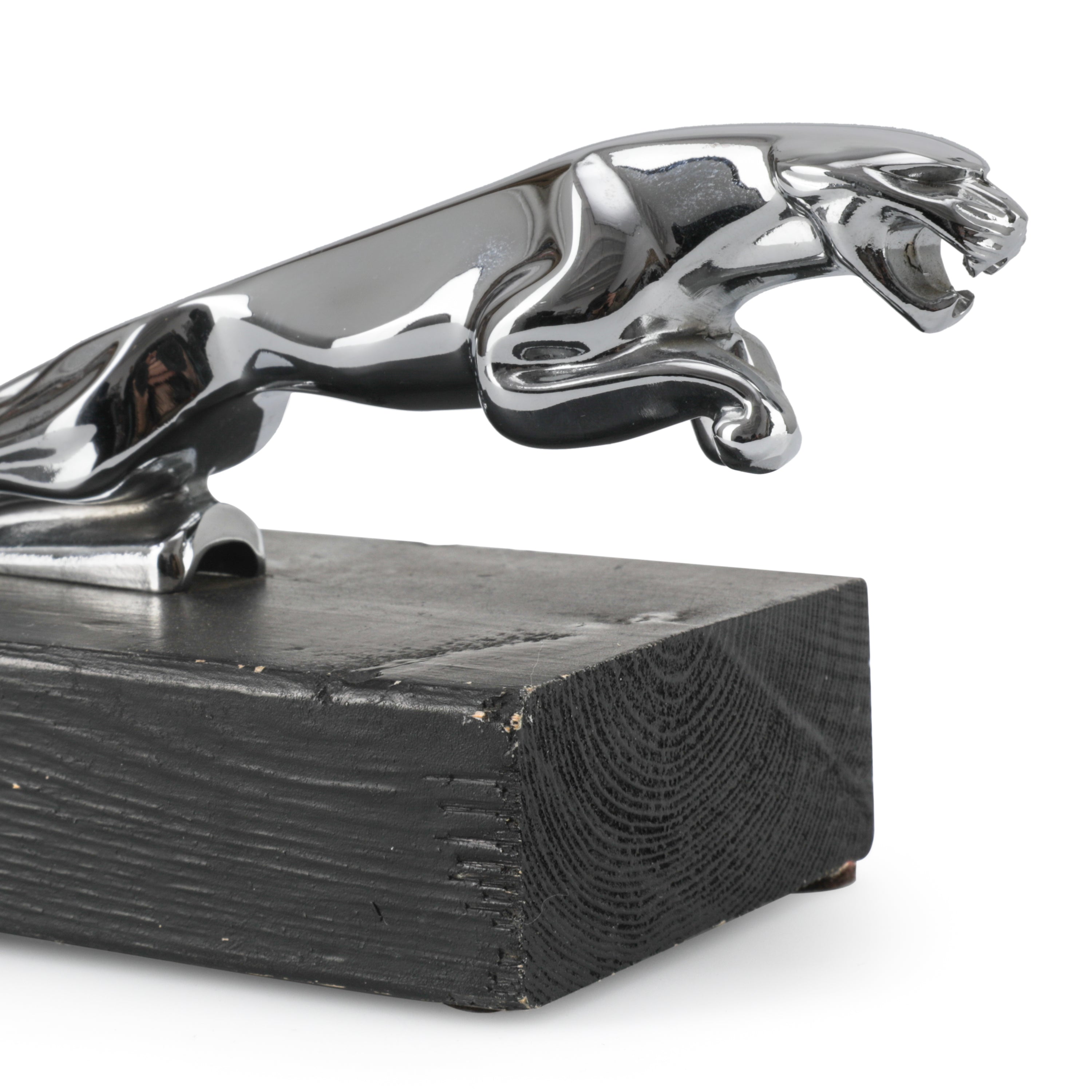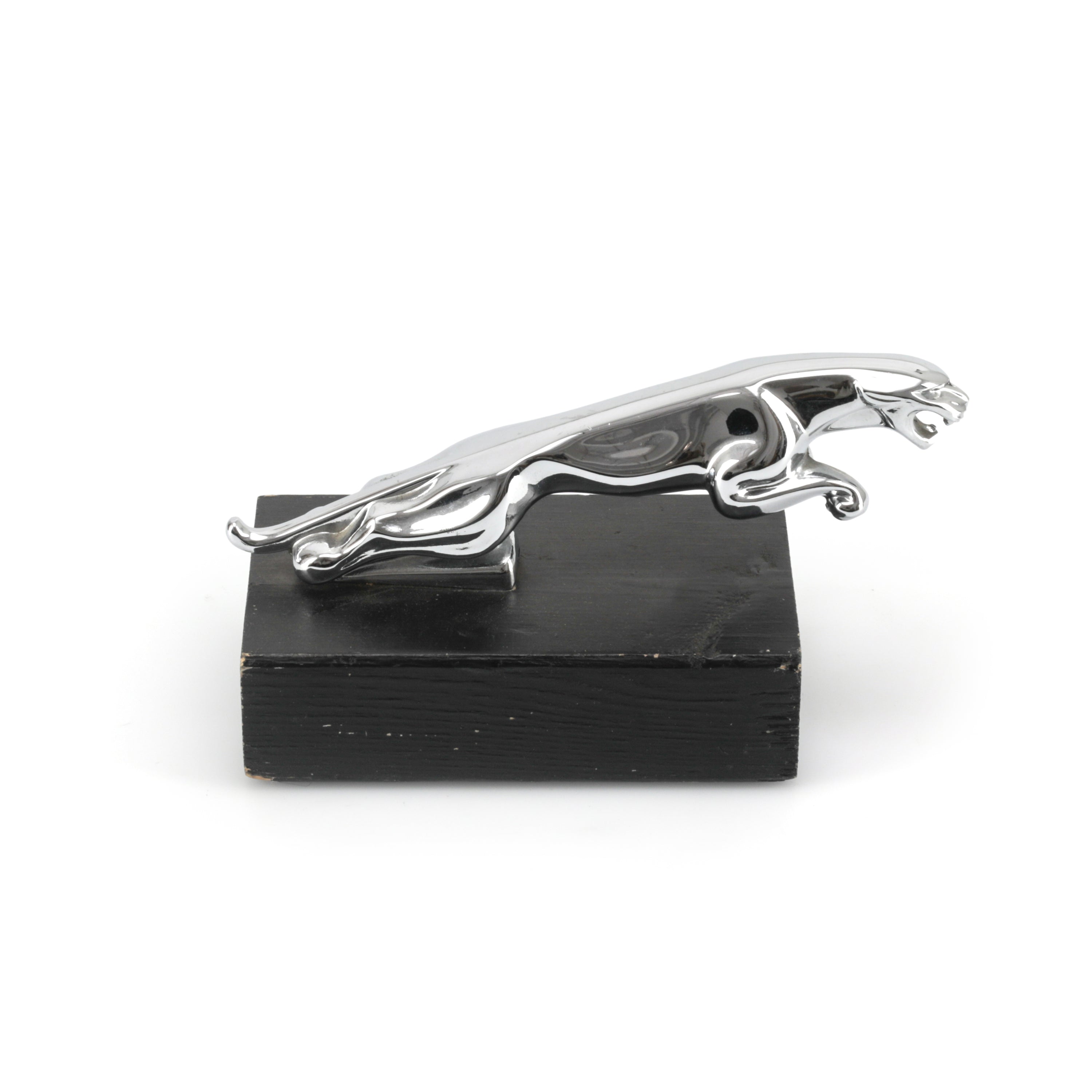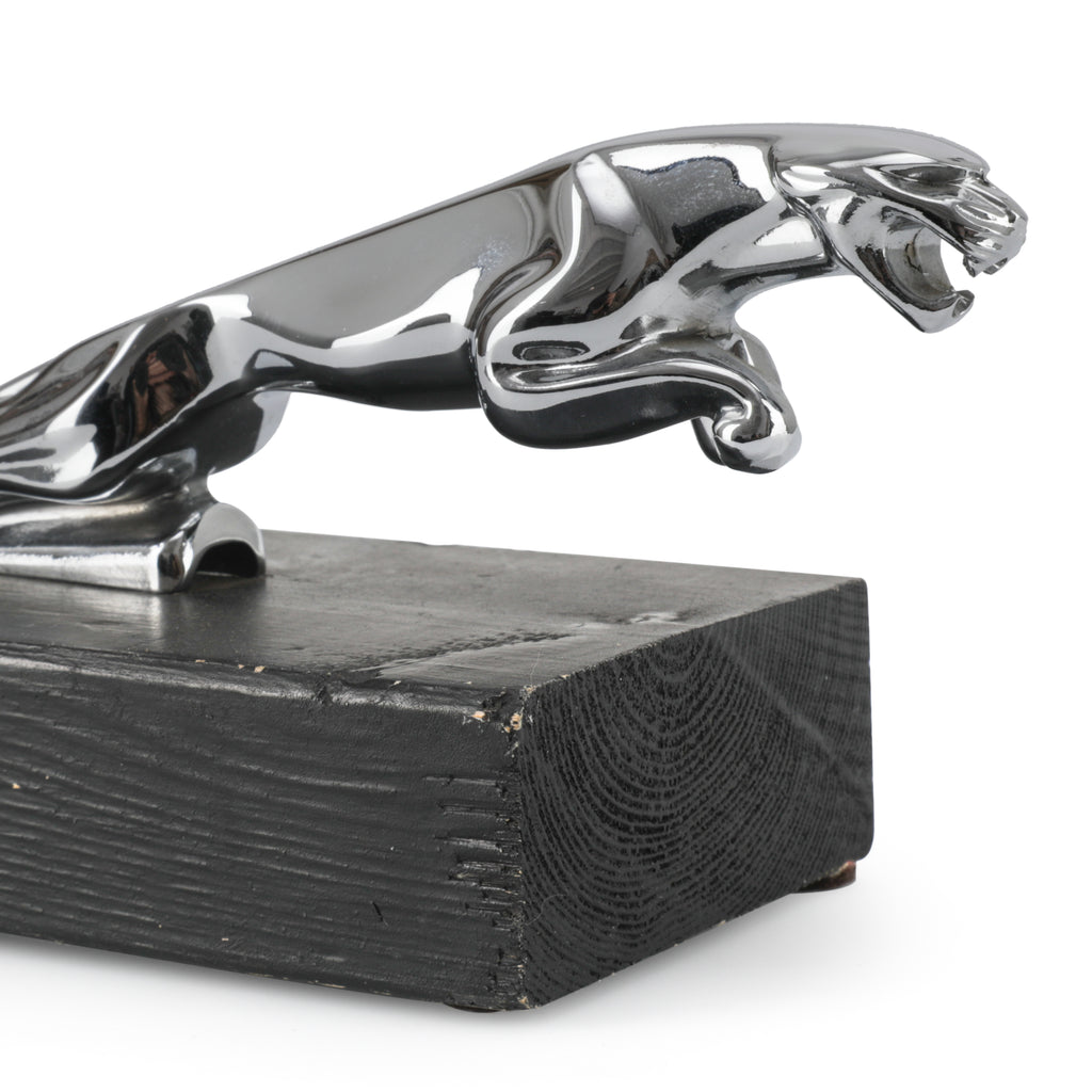 Details: Metallic jaguar mounted on a black rectangular wooden base. Dimensions: 4" H x 5.5" W x 3.5" D
