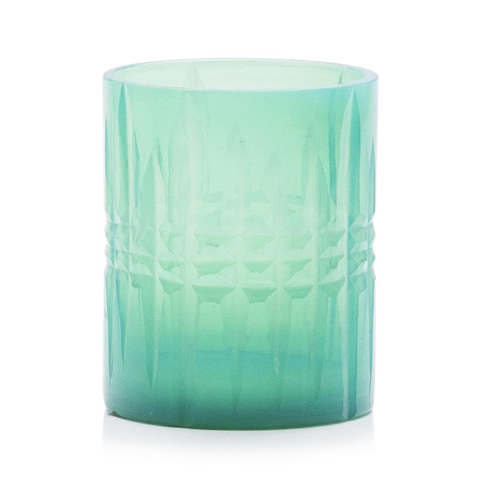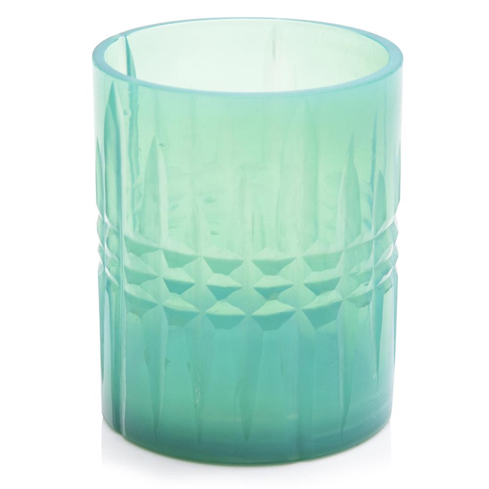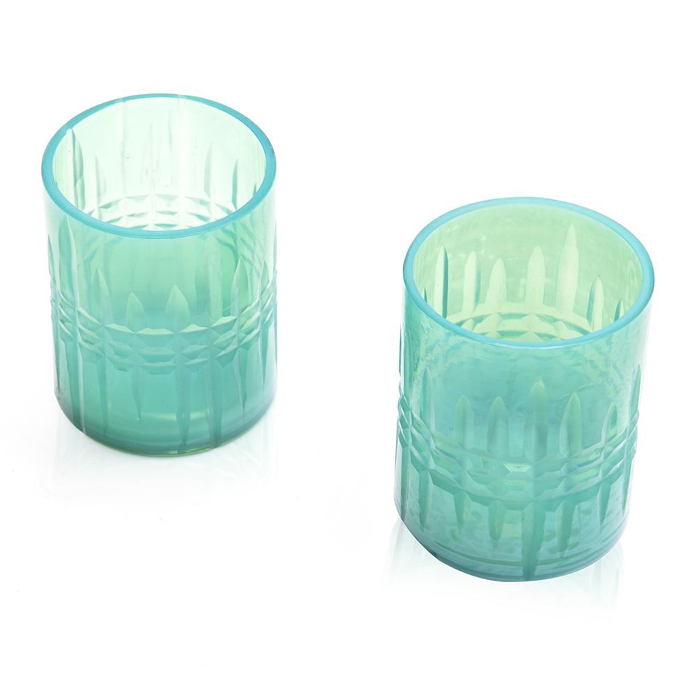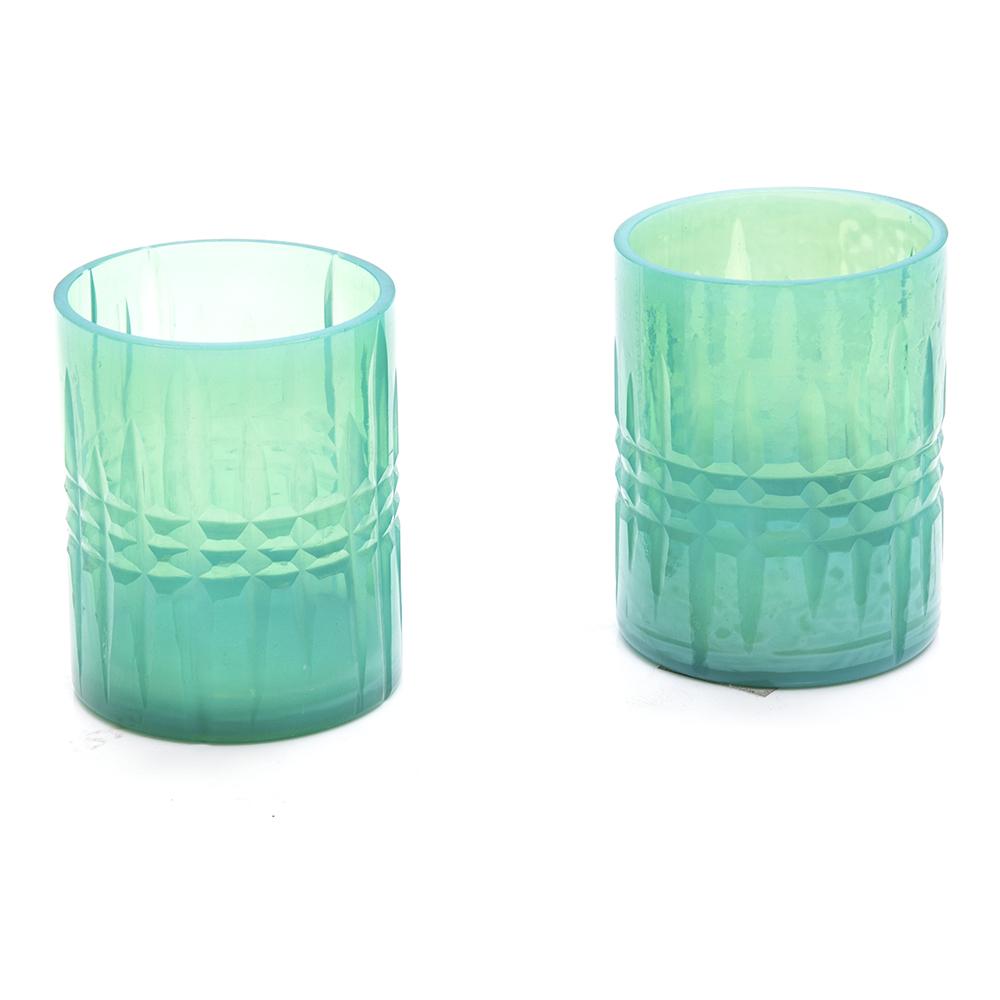 Details: Aqua Translucent Tea Light Candle Holder, Cylinder, Hoth, Smalls, Table Top, Set of 2 Available, Engraved Glass, BFA