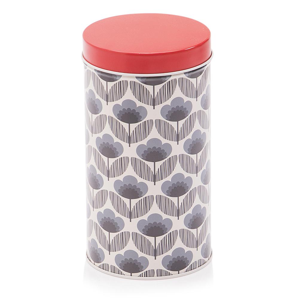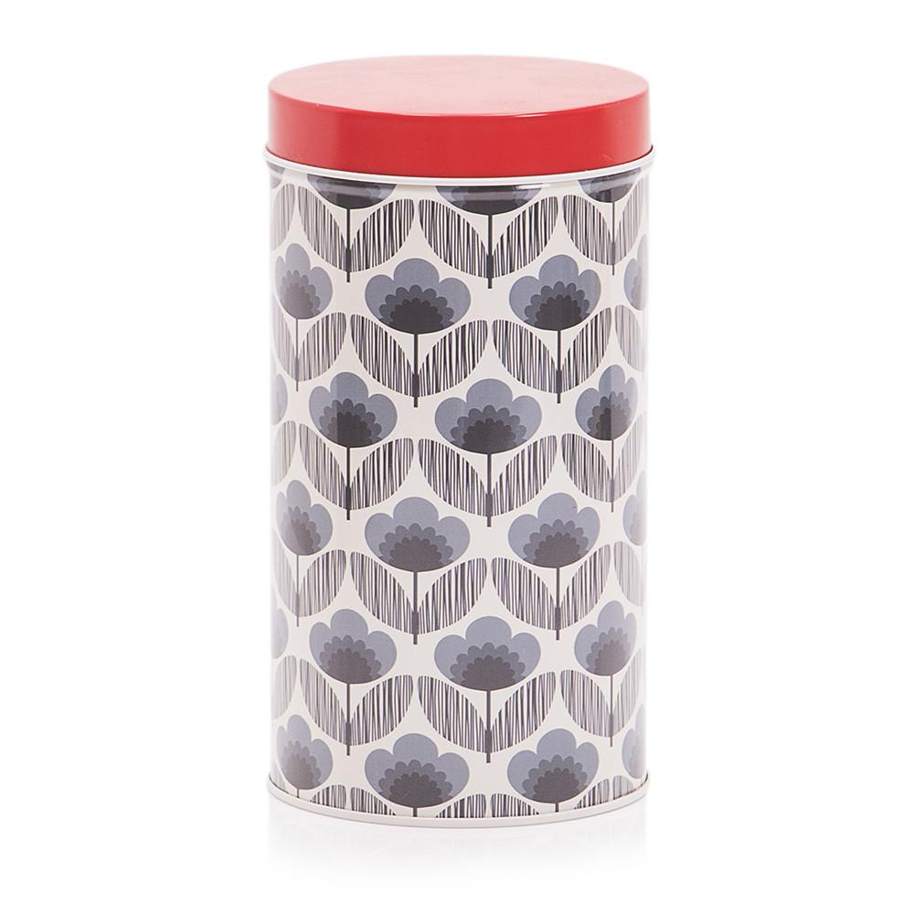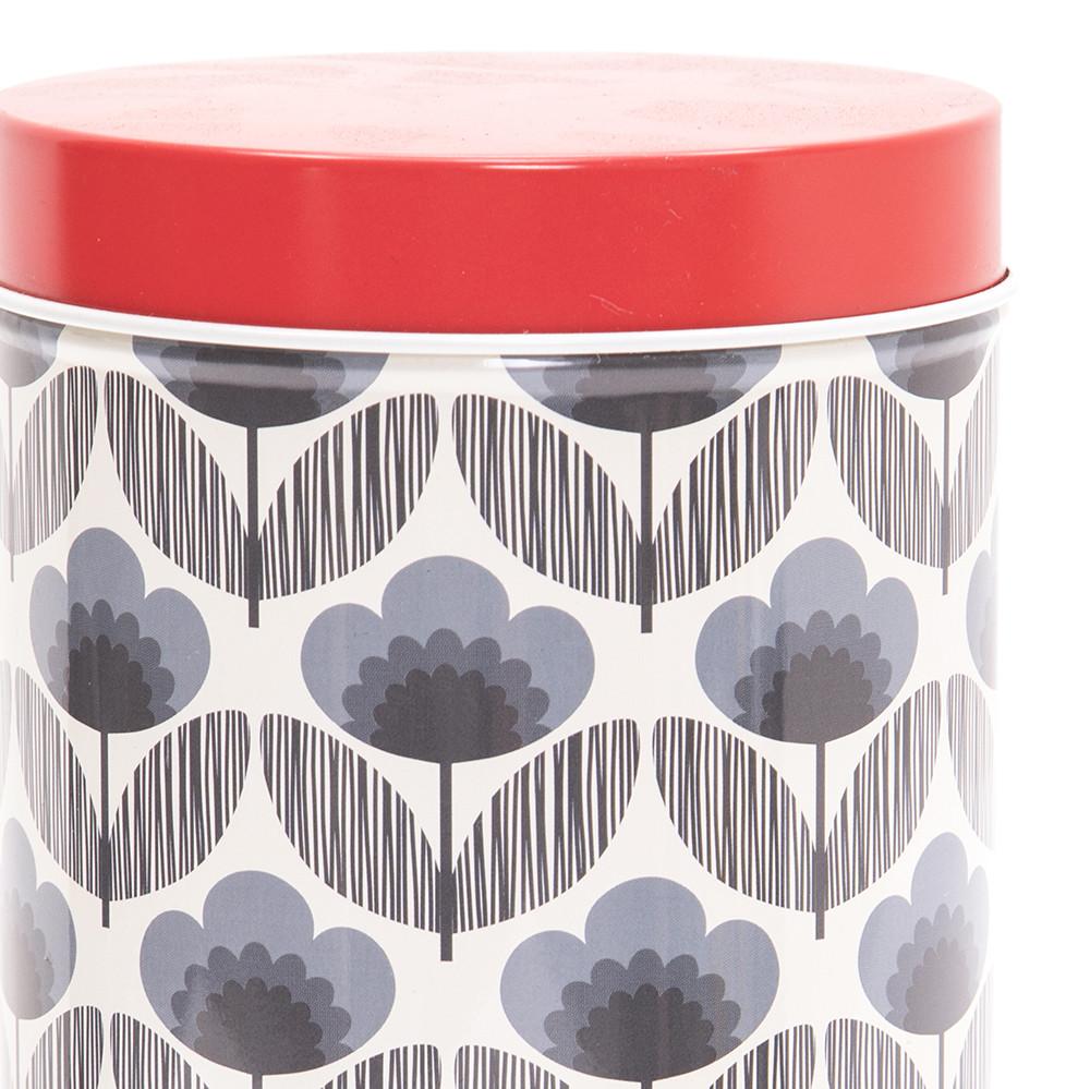 Details: Black tin with mid century floral design with red lid.