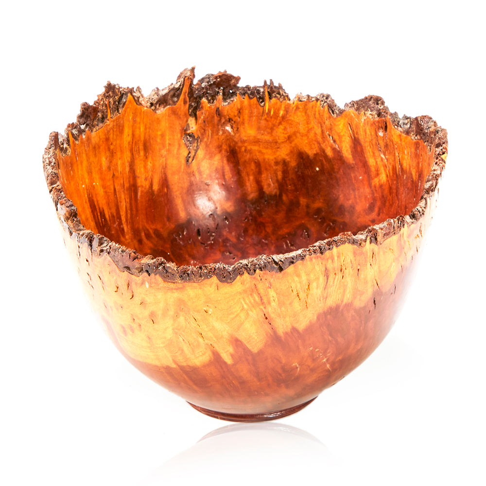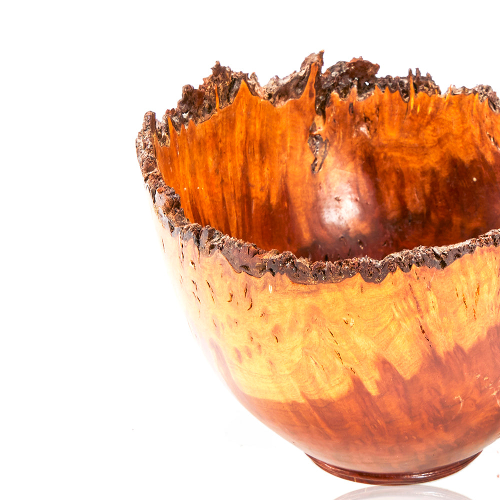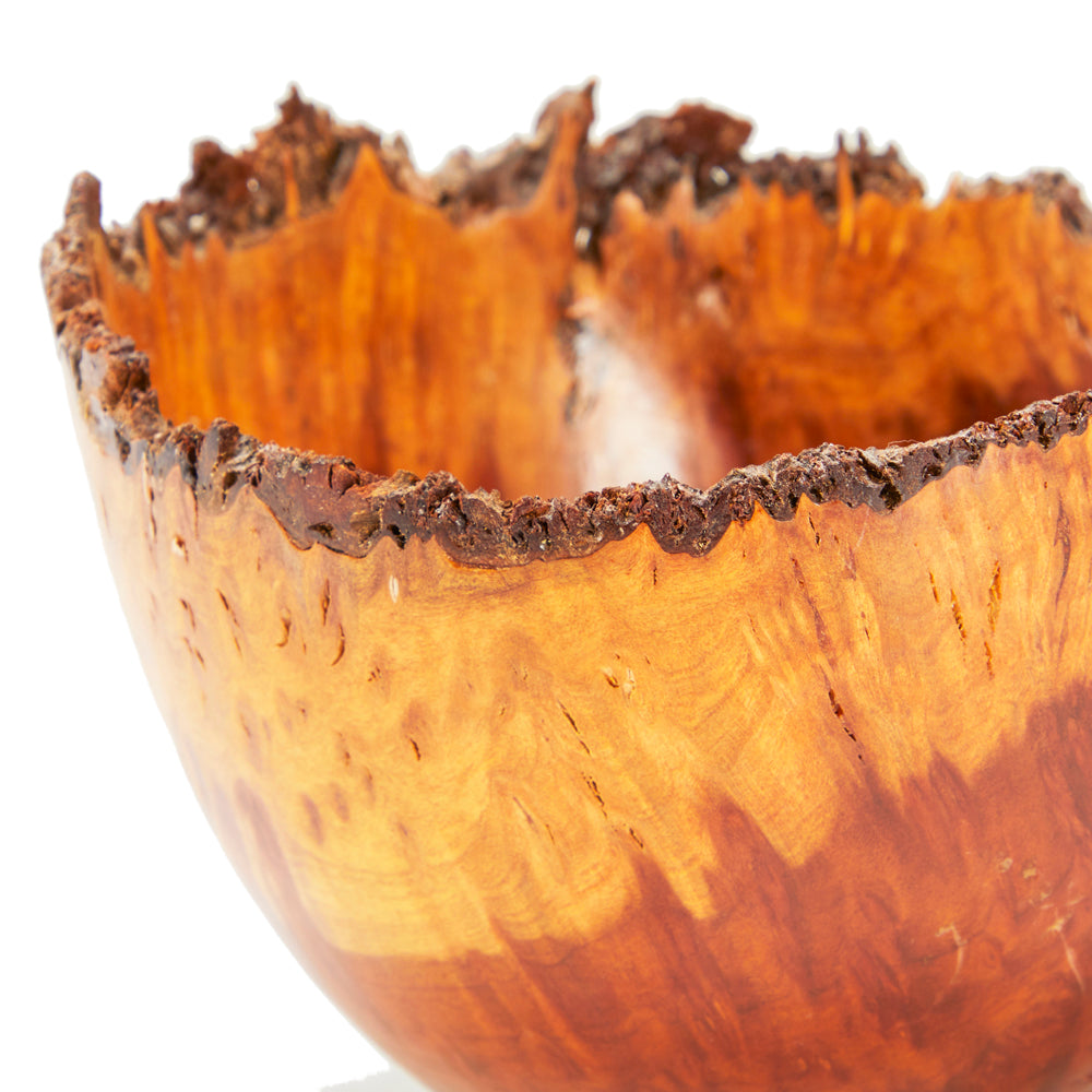 Details: Burl wood smooth polished bowl with rough-edged rim