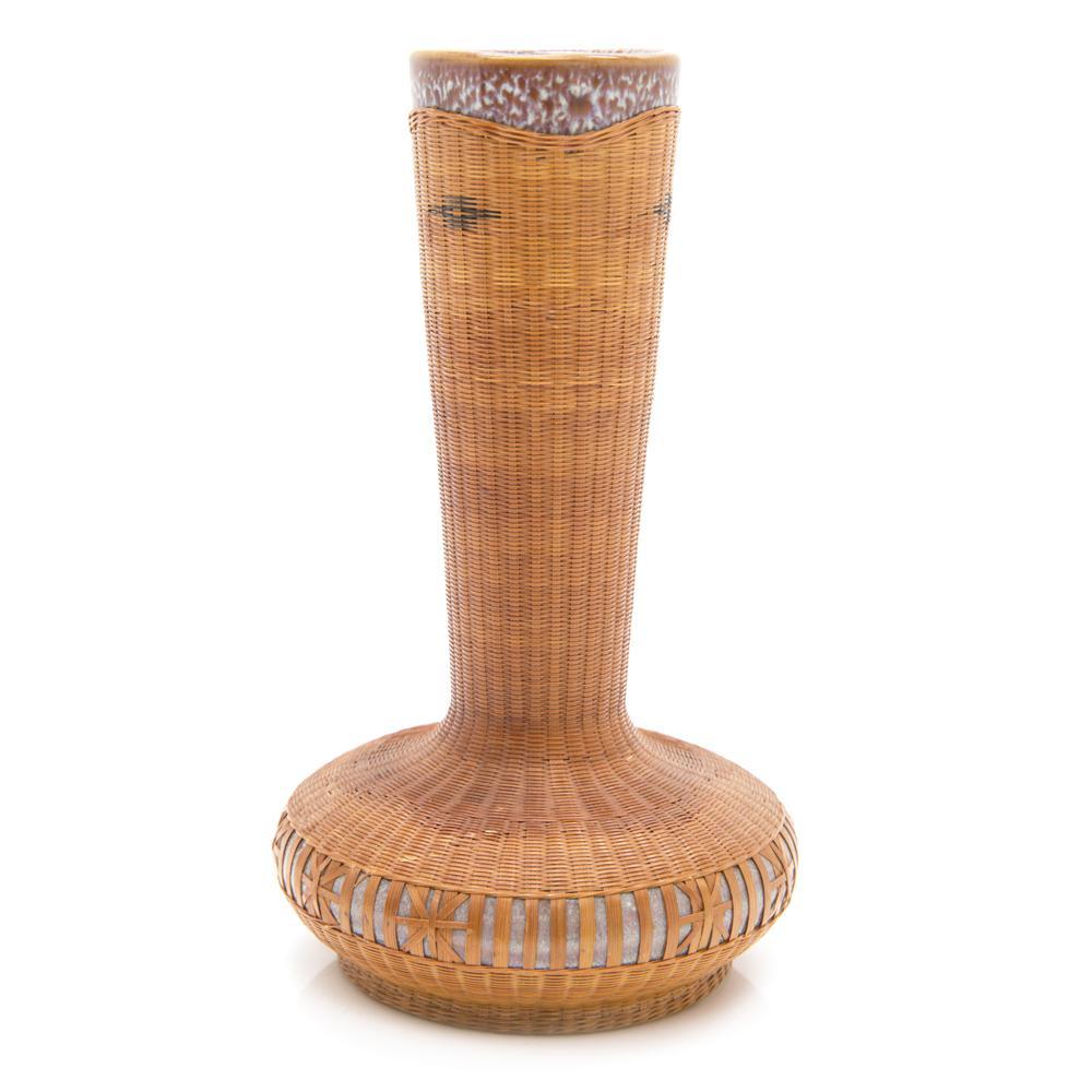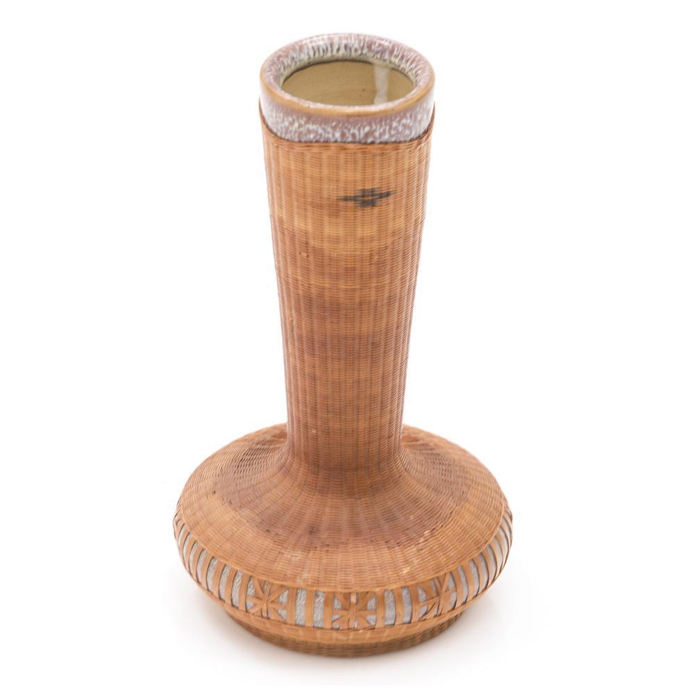 Details: Vase woven from rattan with wide base and reverse tapering top lip Dimensions: 6.5" H x 4" W x 2" D