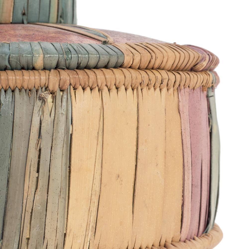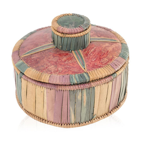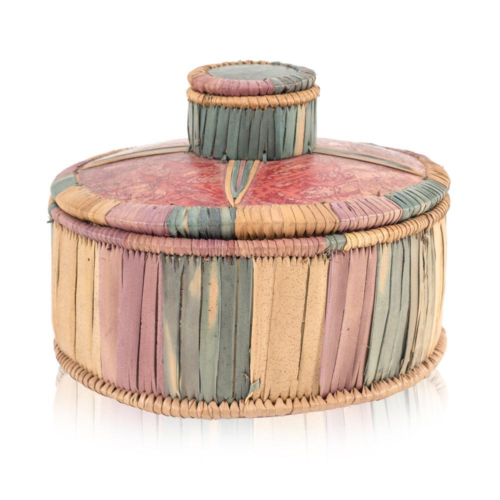 Details: Multicolored woven rattan basket box. Dimensions: 6.5" H x 8" W x 8" D