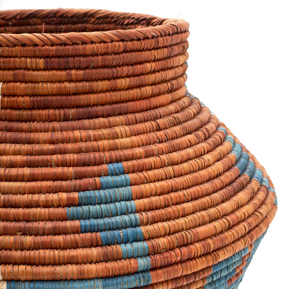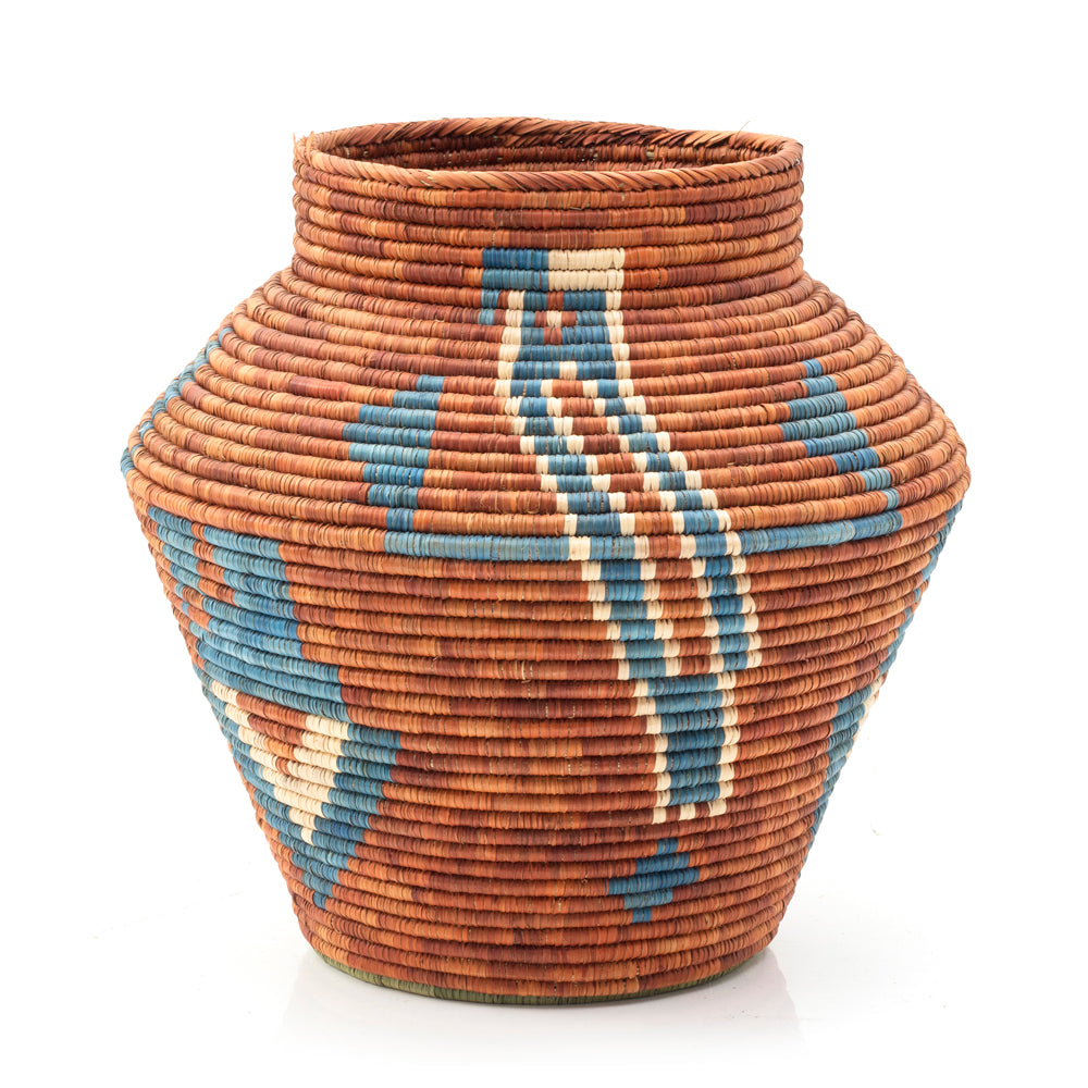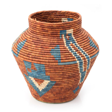Details: South west style basket with blue and white patterns amongst a reddish brown. Dimensions: 21.5" H x 21" D